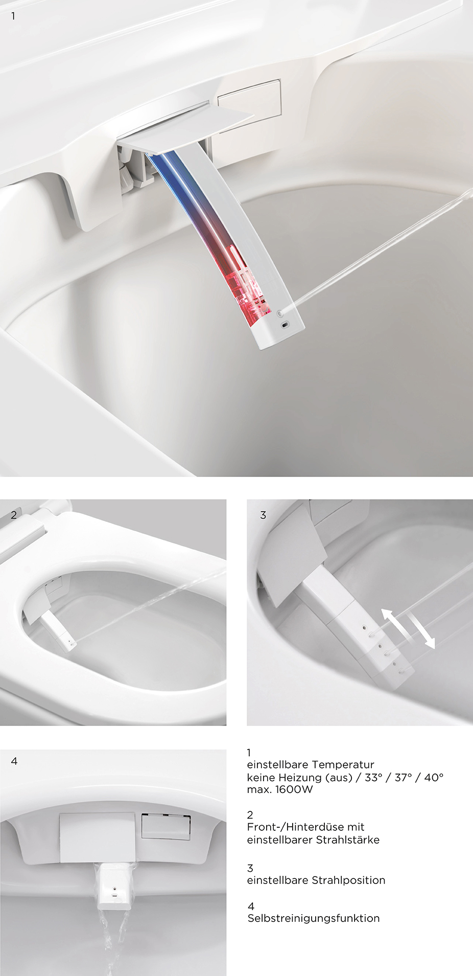 Die Bidetdusche und die Ladydusche – mit einstellbarer Stärke, Temperatur und Position – sorgen für ein äußerst angenehmes und sauberes Gefühl.