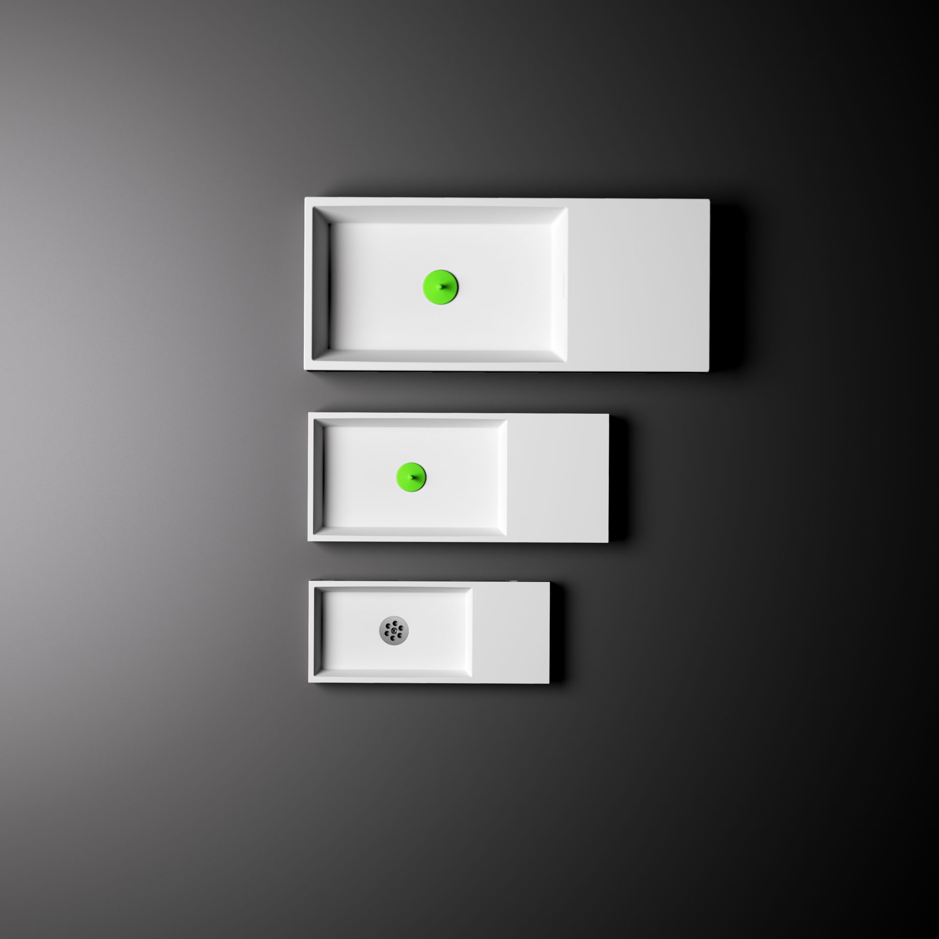 Diese Handwaschbecken sind raffiniert, praktisch und vielseitig. Die rechten Winkel, die schlanke Armaturenbank und die perfekt dimensionierten niedrigen Wände verleihen ihnen ein äußerst architektonisches Erscheinungsbild. Die farbigen Wasserstopps machen es verspielt und lebendig.