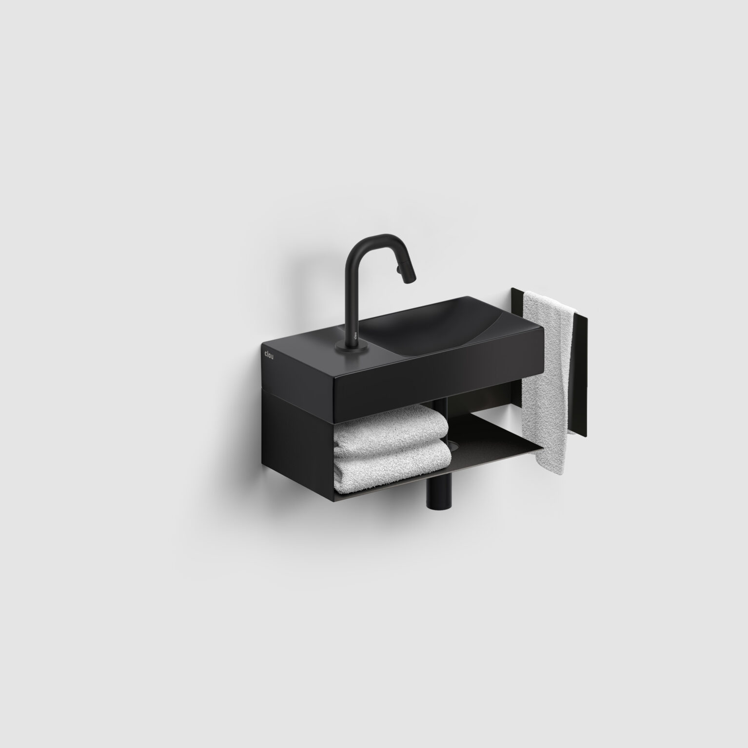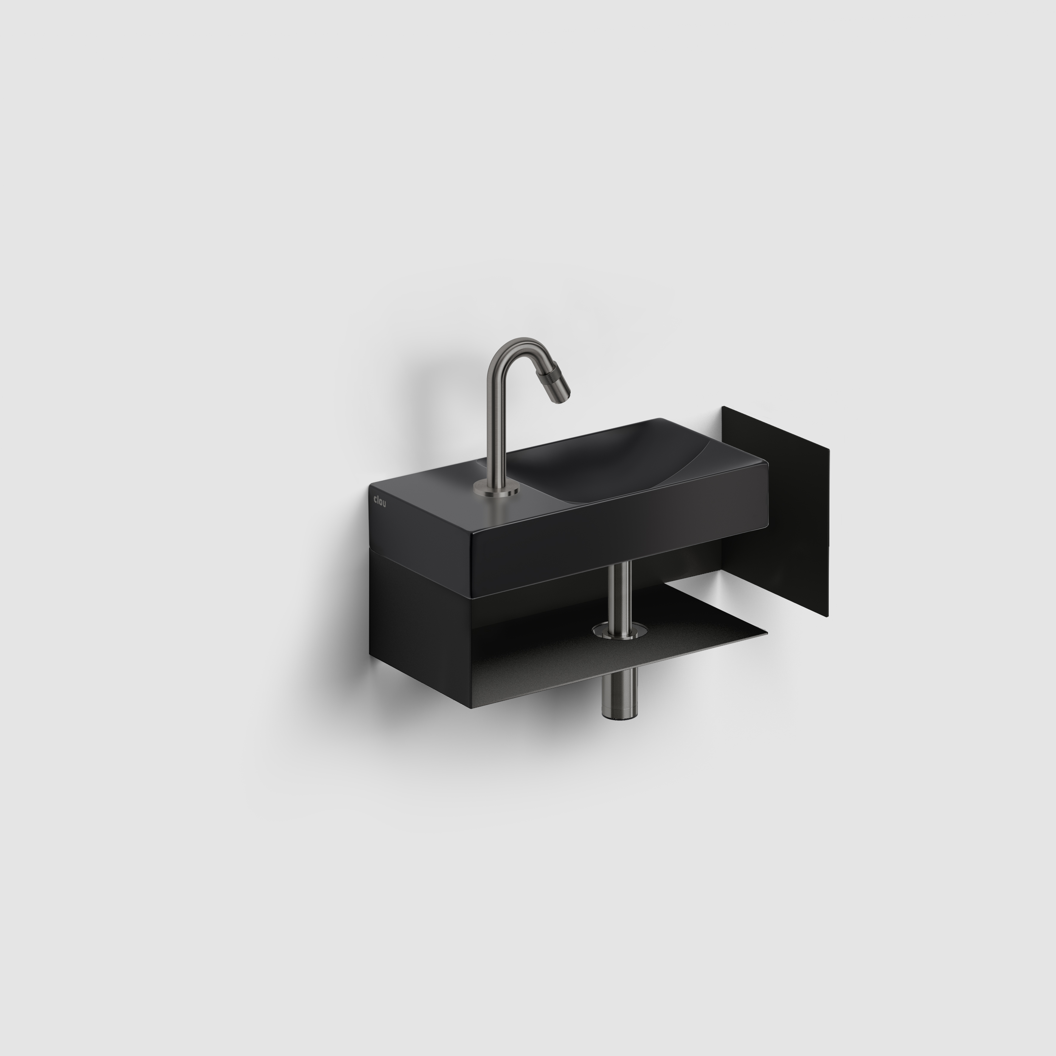 Vale Handwaschbecken, mit Hahnloch links, mit integriertem Ablauf, matt schwarz Keramik. Verwendbar für Wandmontage und Gegenmontage. Nicht verschließbar.