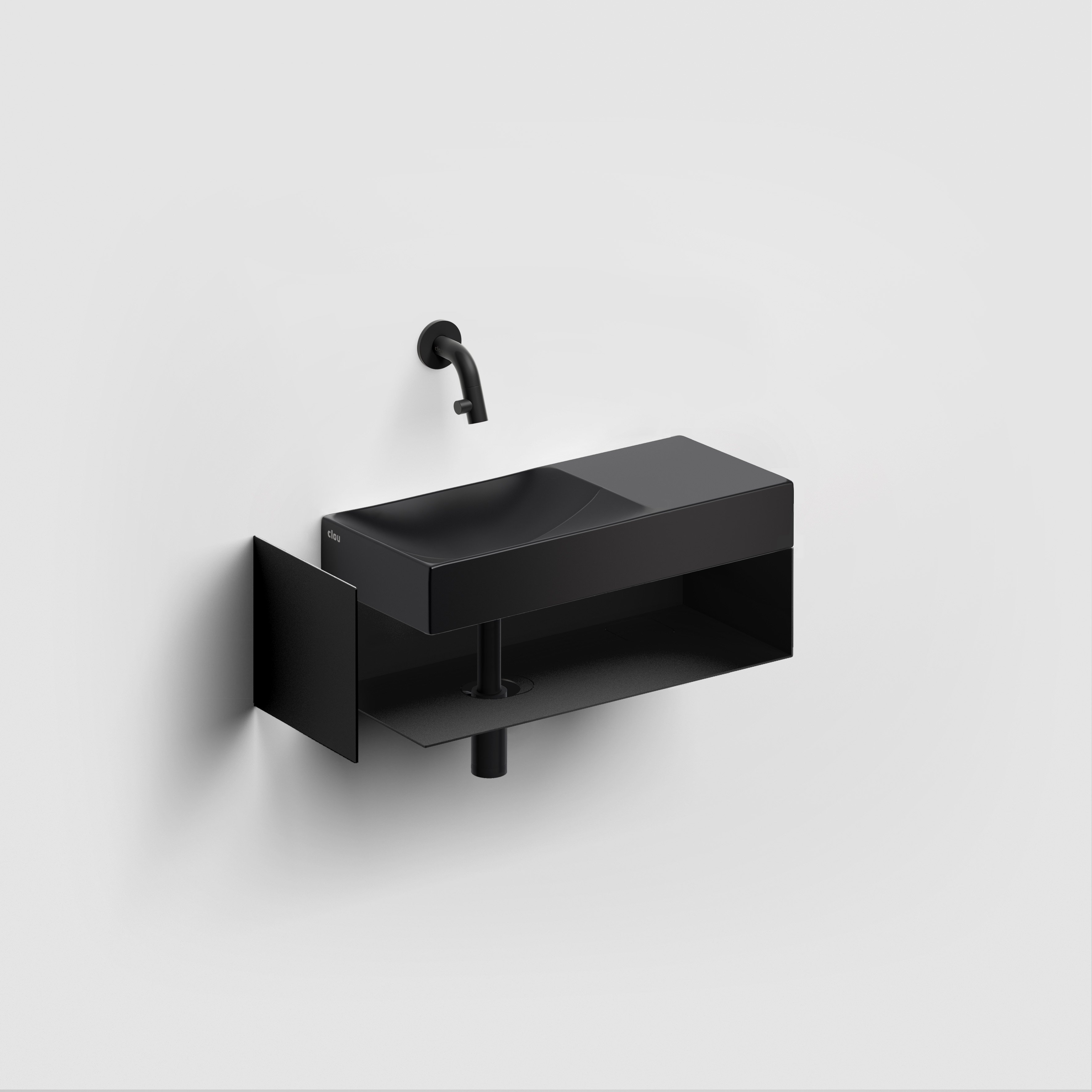 Vale Handwaschbecken, ohne Hahnloch rechts, mit integriertem Ablauf, matt schwarz Keramik. Verwendbar für Wandmontage und Gegenmontage. Nicht verschließbar.