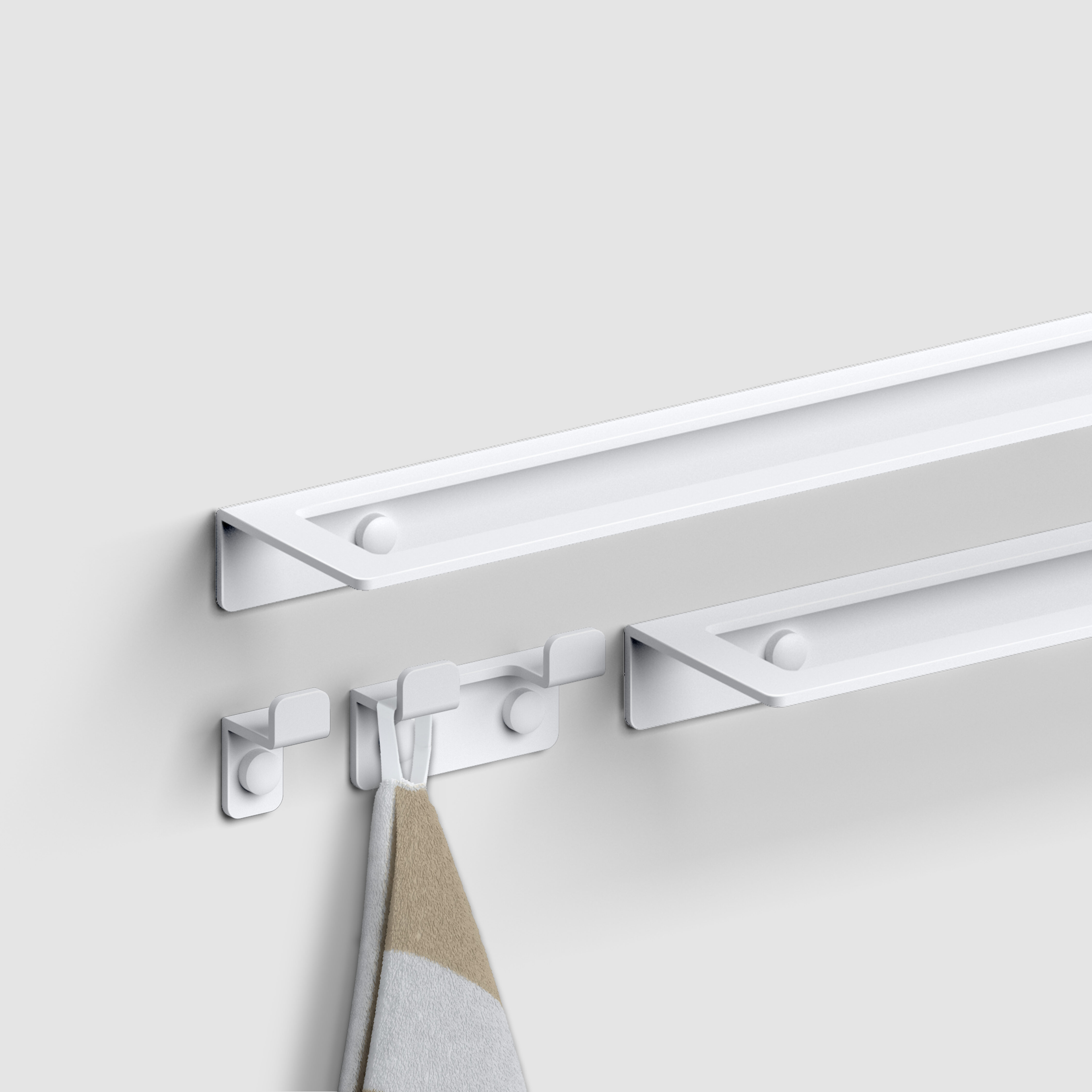 Fold Accessoires aus Chrom, Edelstahl gebürstet, matt Weiß oder matt Schwarz pulverbeschichtet, oder aus gebürstetem PVD in Gold, Bronze oder Gunmetal.