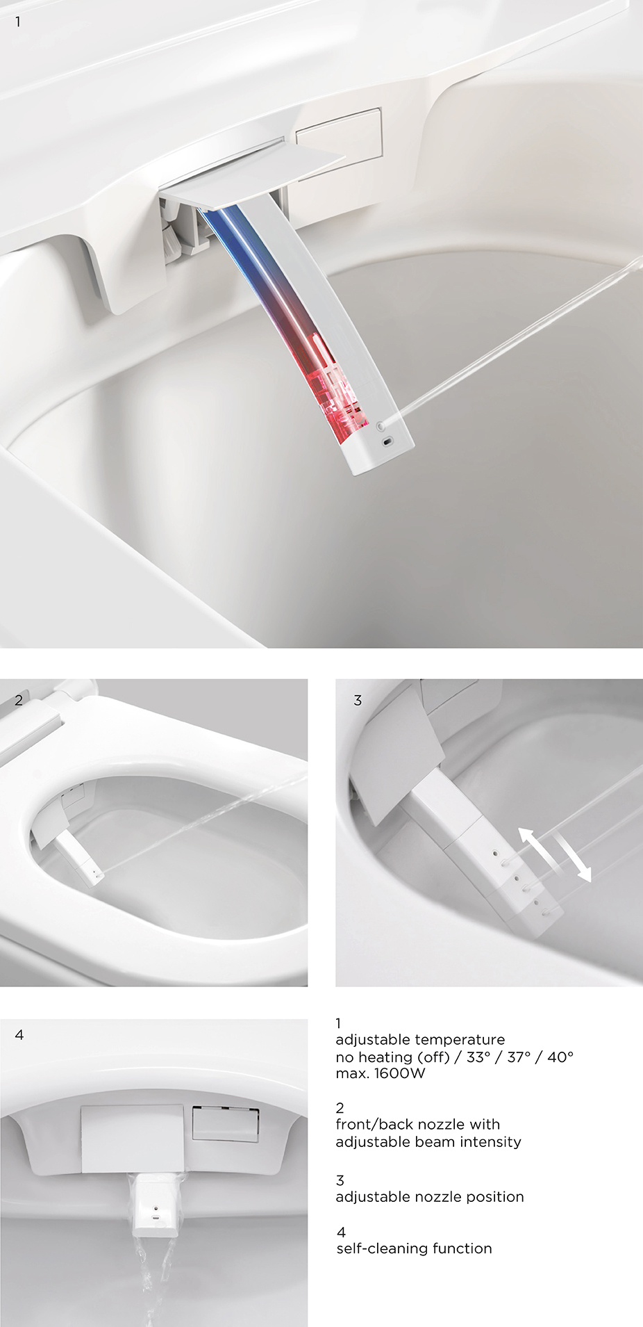 The bidet and lady shower – with adjustable strength, temperature and position – provide an ultra-comfortable and clean feeling.