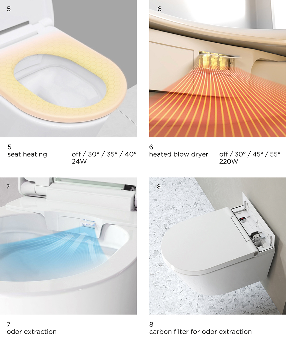 When opening the lid, the seat will always be at the desired temperature. The odor extraction starts automatically when the lid is opened and stops when it is closed.