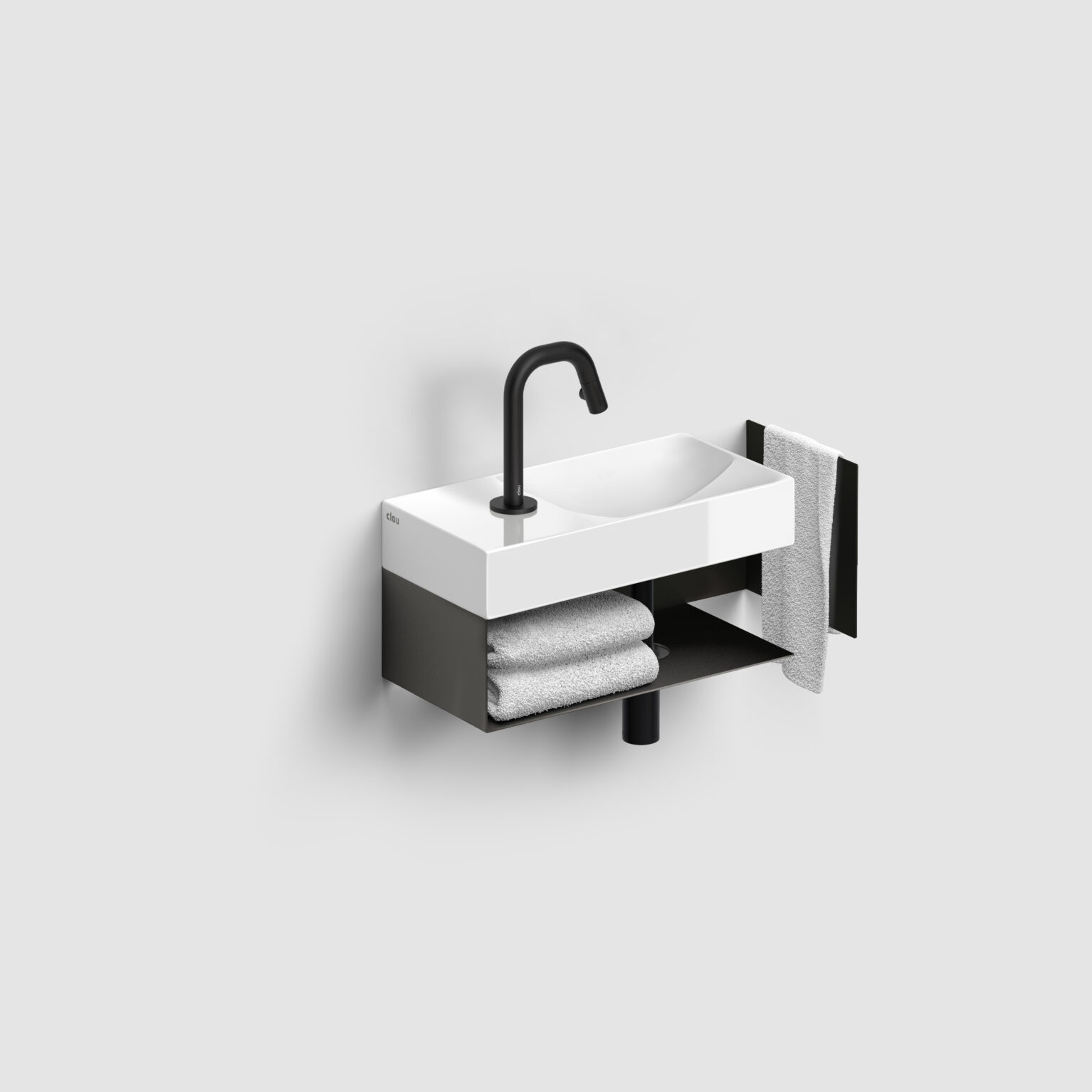 Vale handbasin, with tap hole left, with integrated drain, glossy white ceramics. Suitable for wall mounting and counter mounting. Not closable.