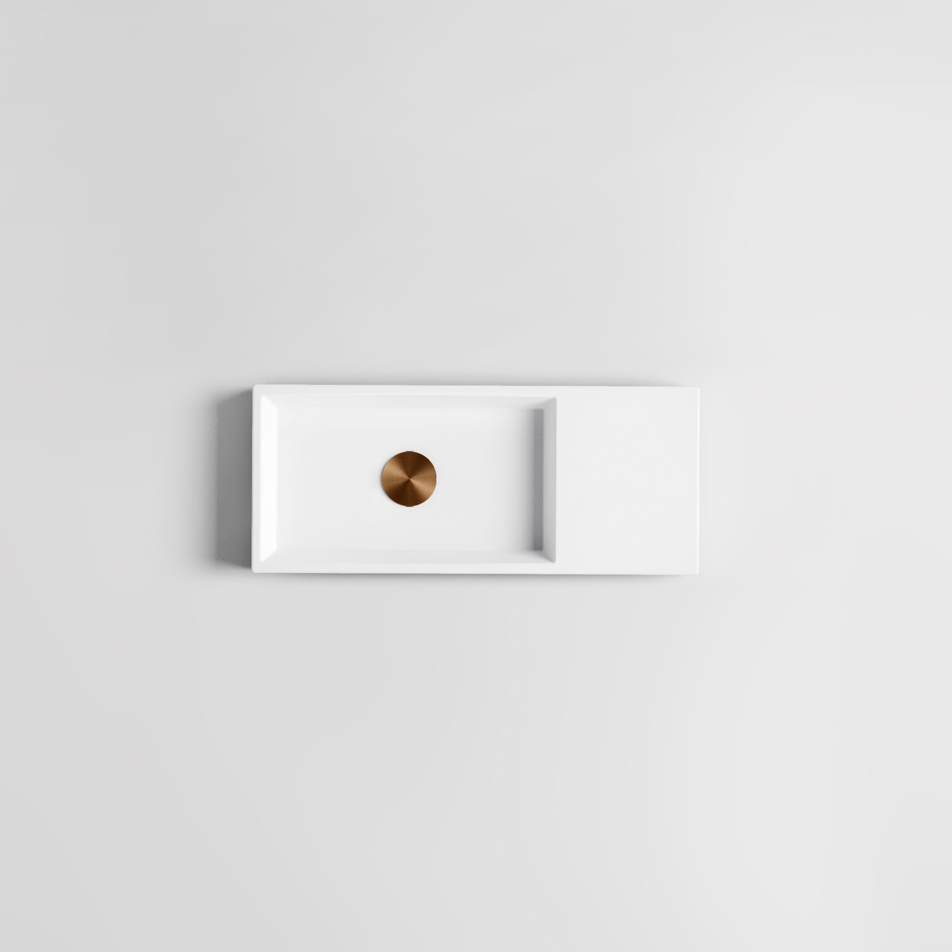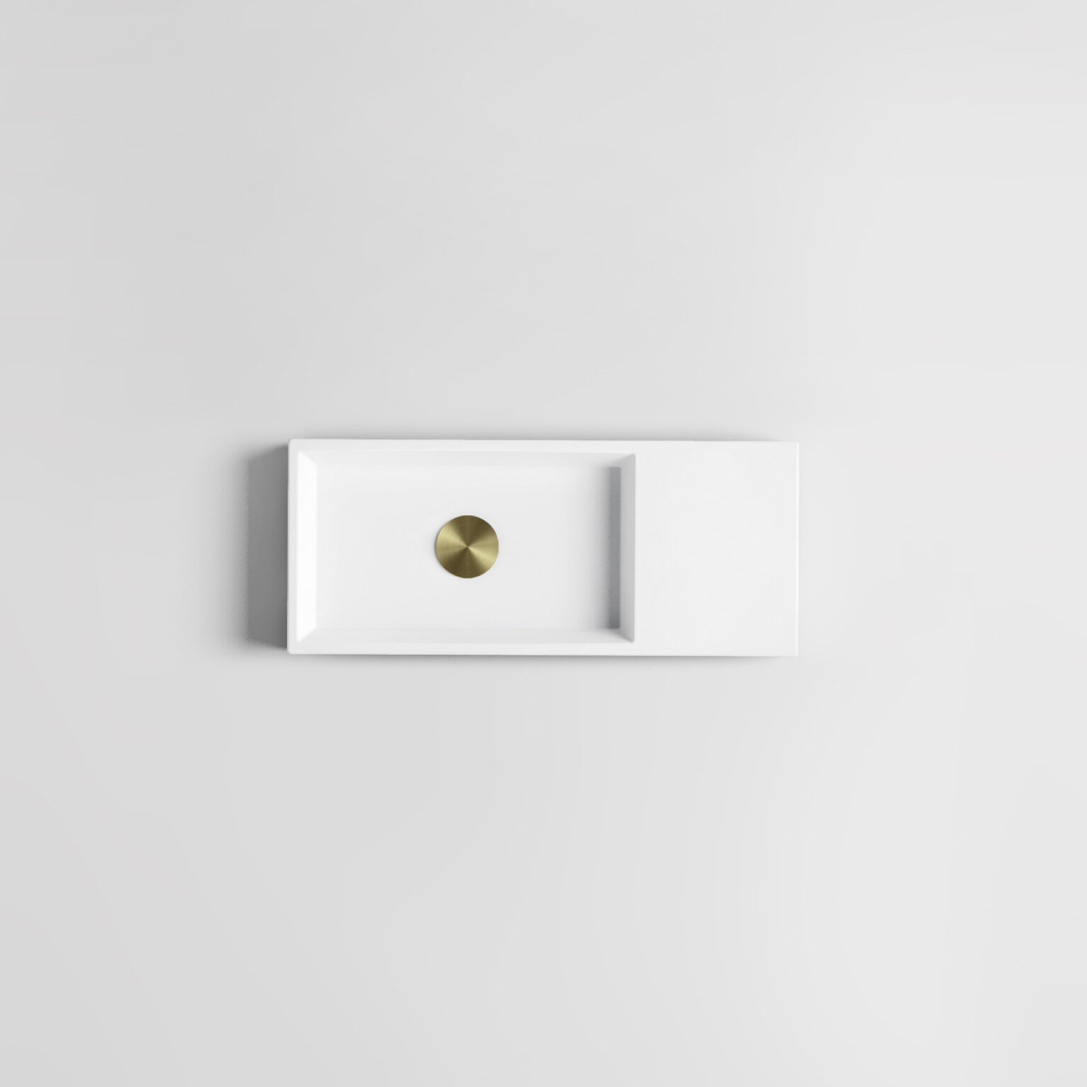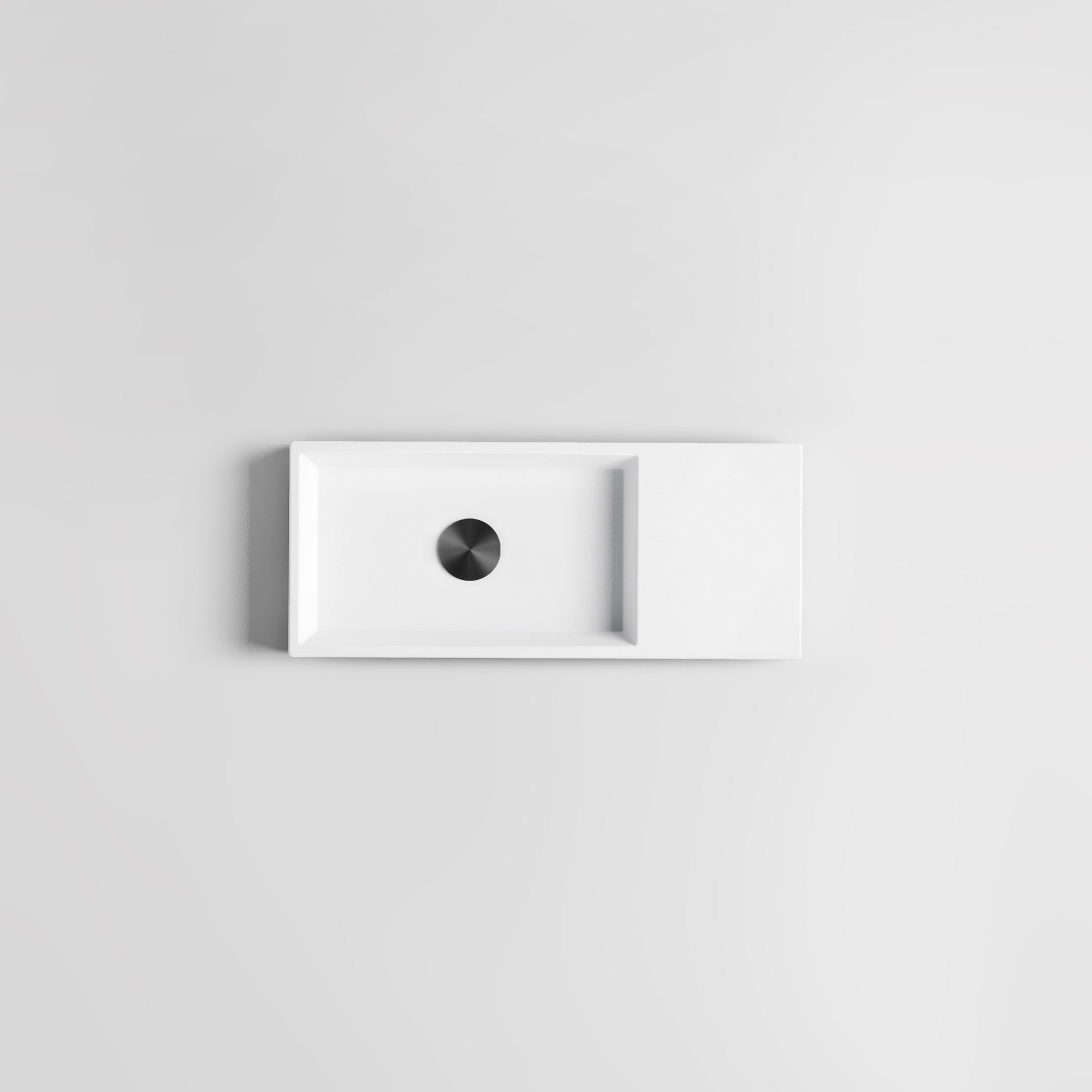 Mini Wash Me wash-hand basin with pretreated tap hole, without drain, right, mineral marble. Suitable for wall mounting and counter mounting. Special smaller drains must be ordered (view ‘complete your product’). A Plus variant is available for the larger toilet spaces.