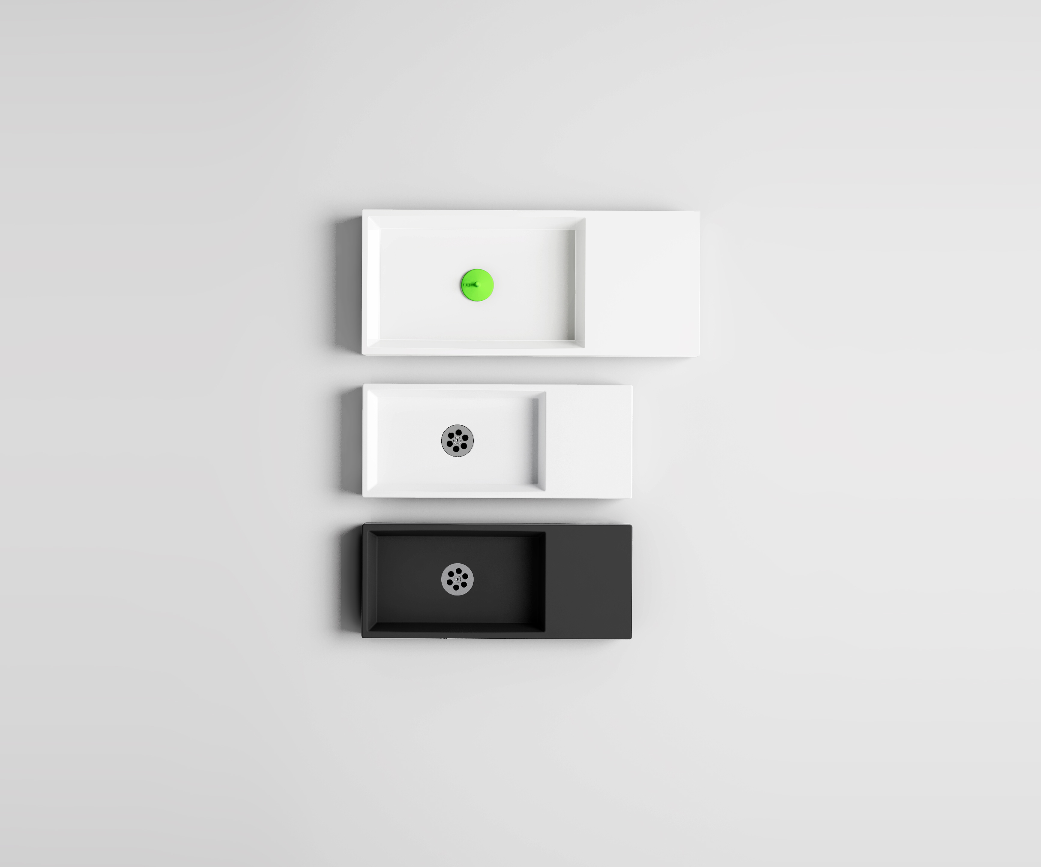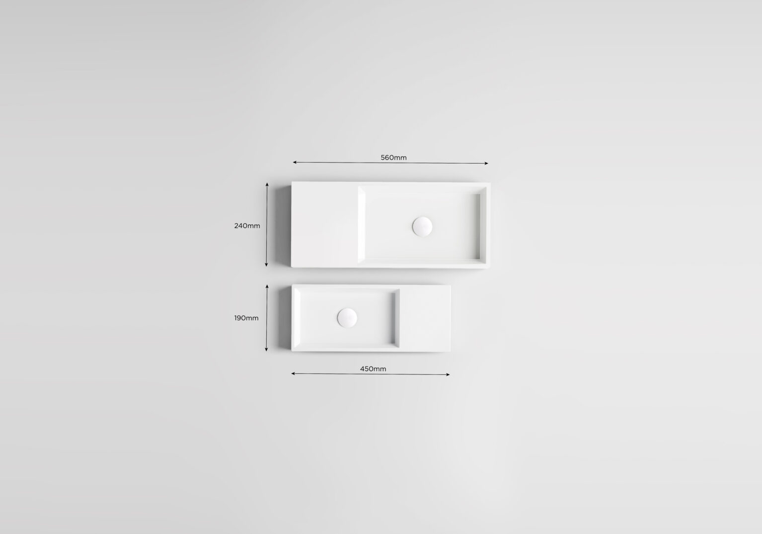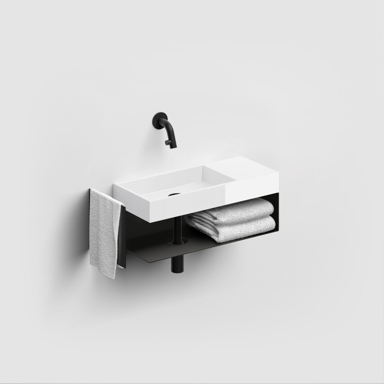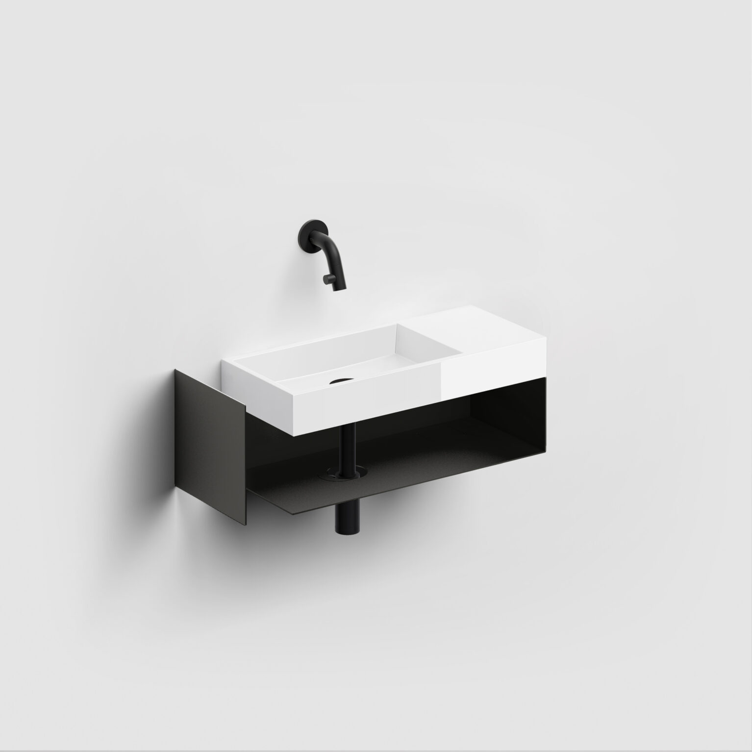 Mini Wash Me wash-hand basin with pretreated tap hole, without drain, right, mineral marble. Suitable for wall mounting and counter mounting. Special smaller drains must be ordered (view ‘complete your product’). A Plus variant is available for the larger toilet spaces.