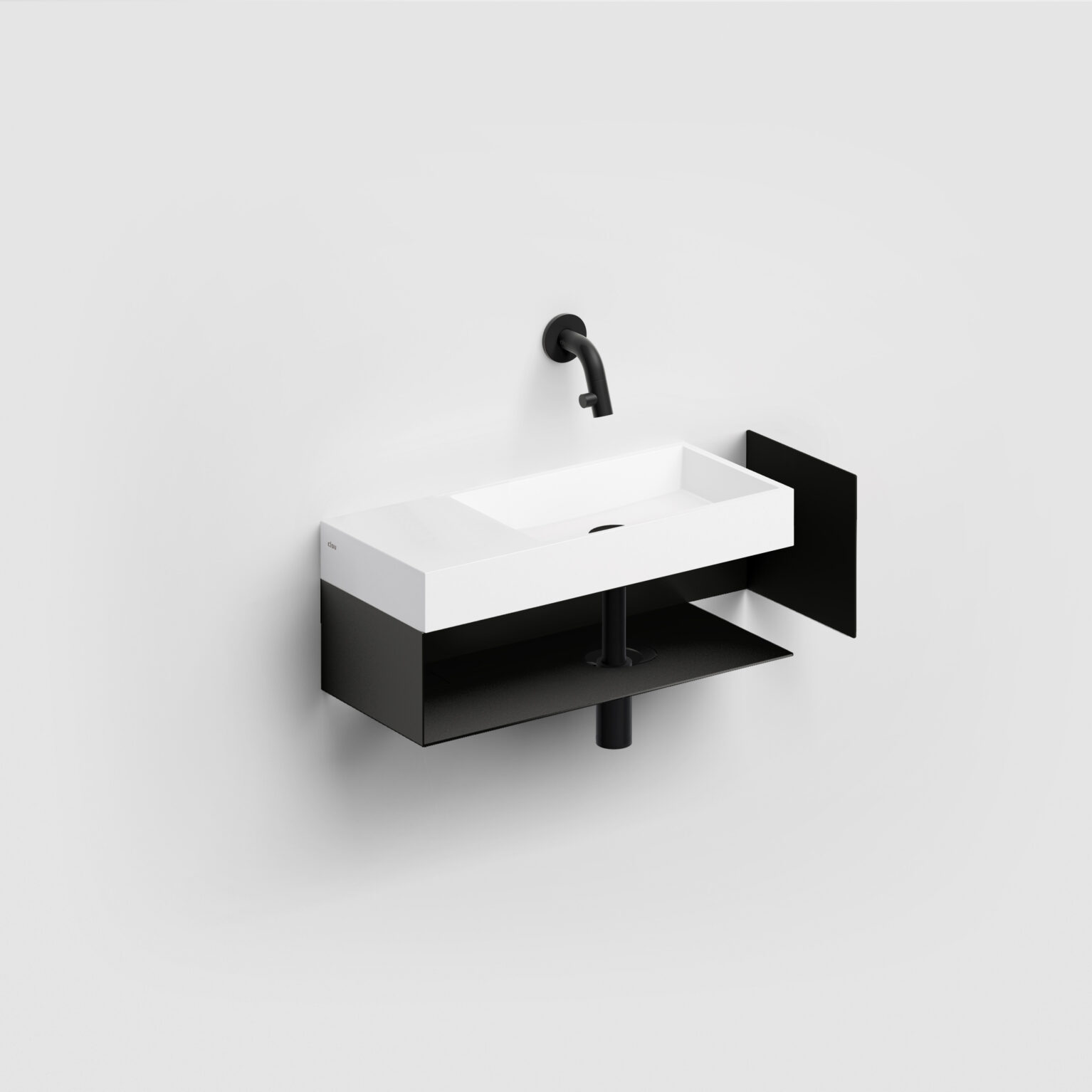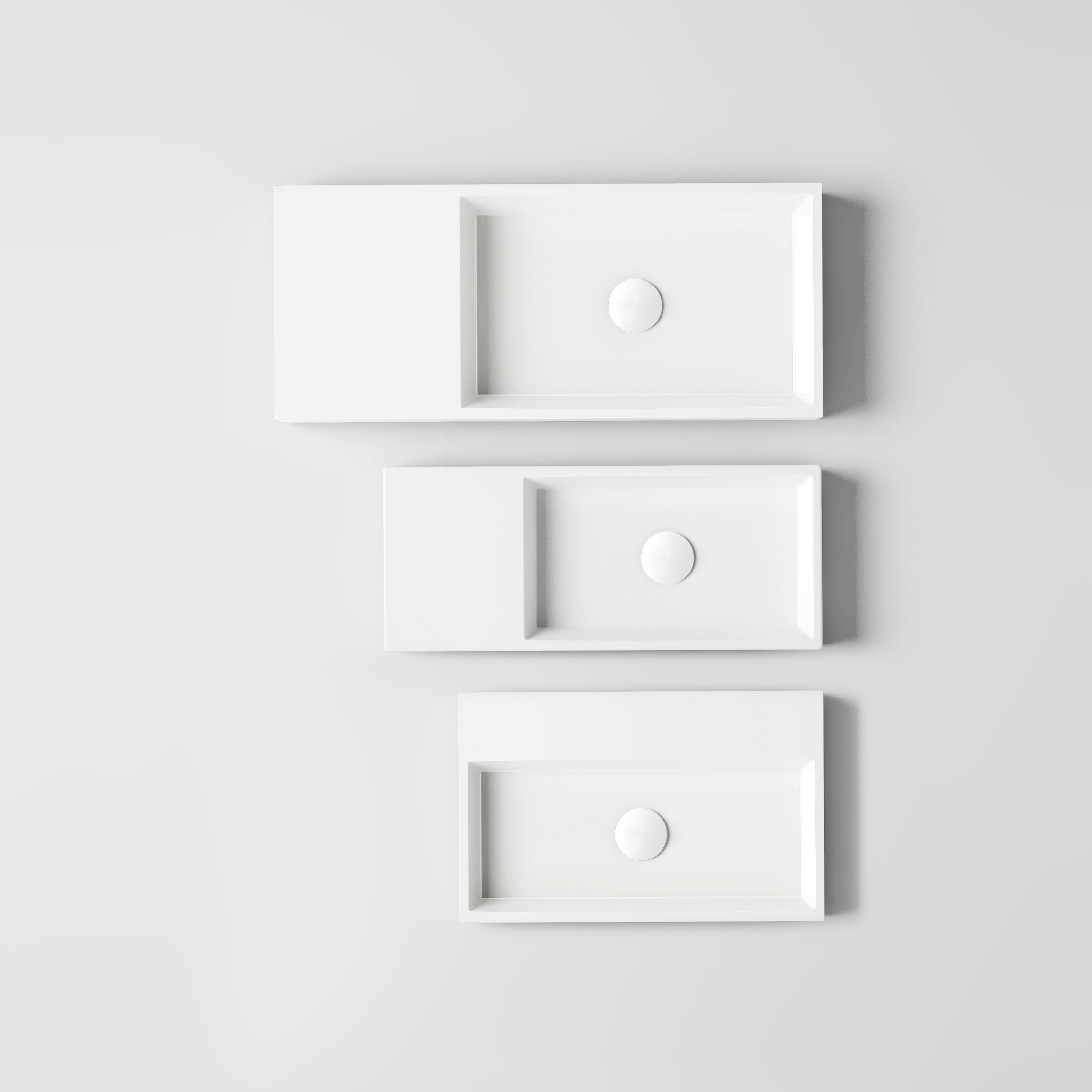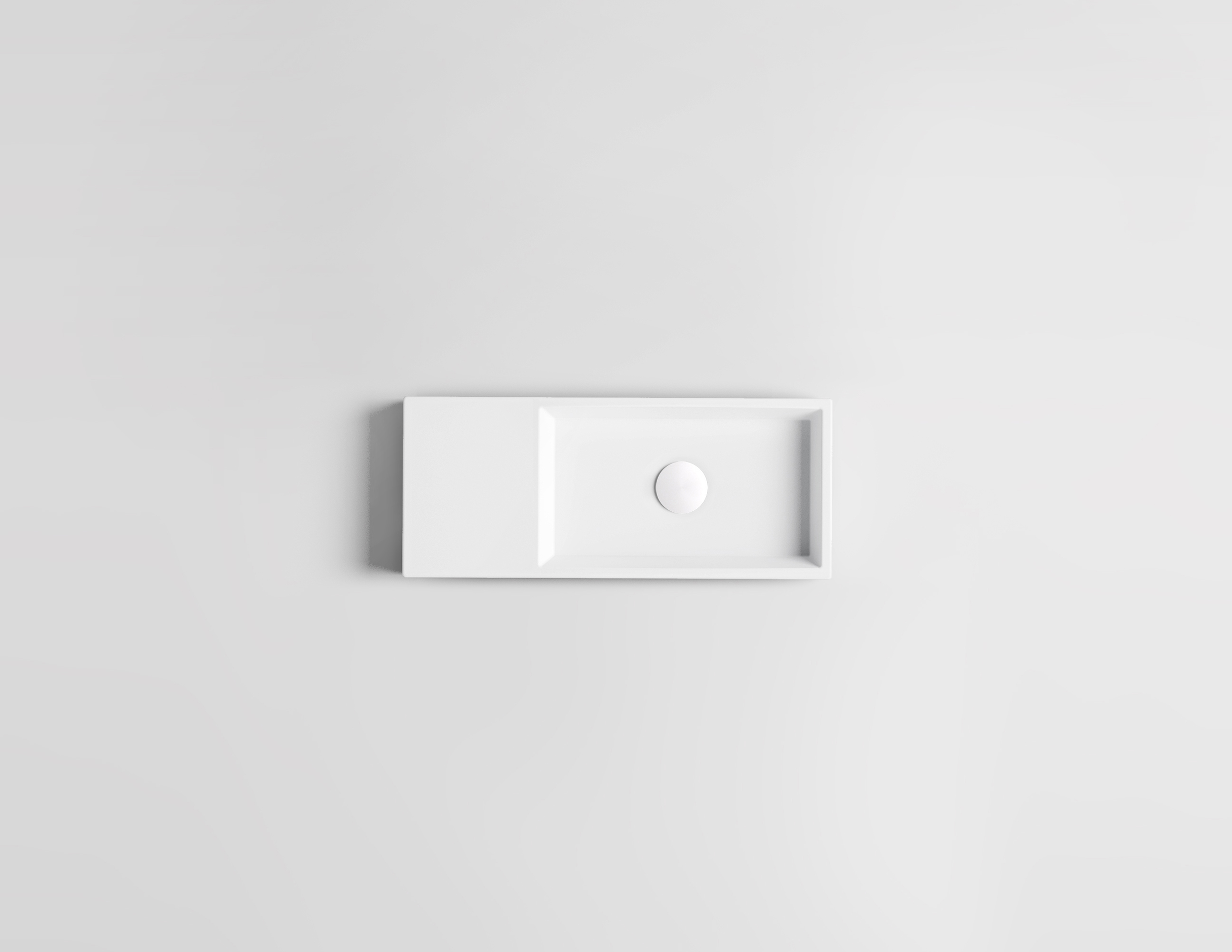 Mini Wash Me wash-hand basin with pretreated tap hole, without drain, left, aluite. Suitable for wall mounting and counter mounting. Special smaller drains must be ordered (view ‘complete your product’). A Plus variant is available for the larger toilet spaces.