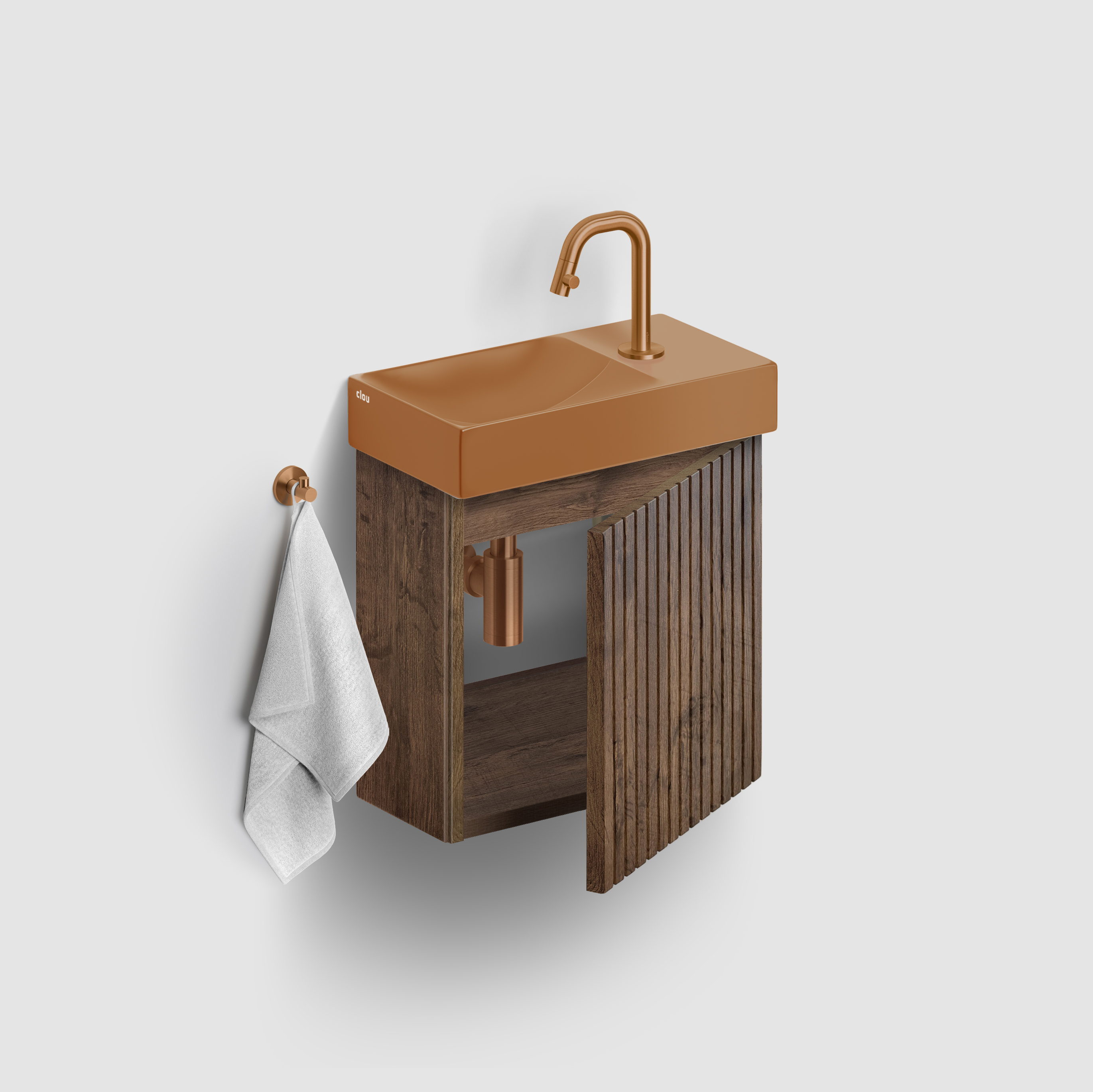 Vale handbasin series, with integrated drain and trap connection. Suitable for wall mounting and counter mounting. Not closable.