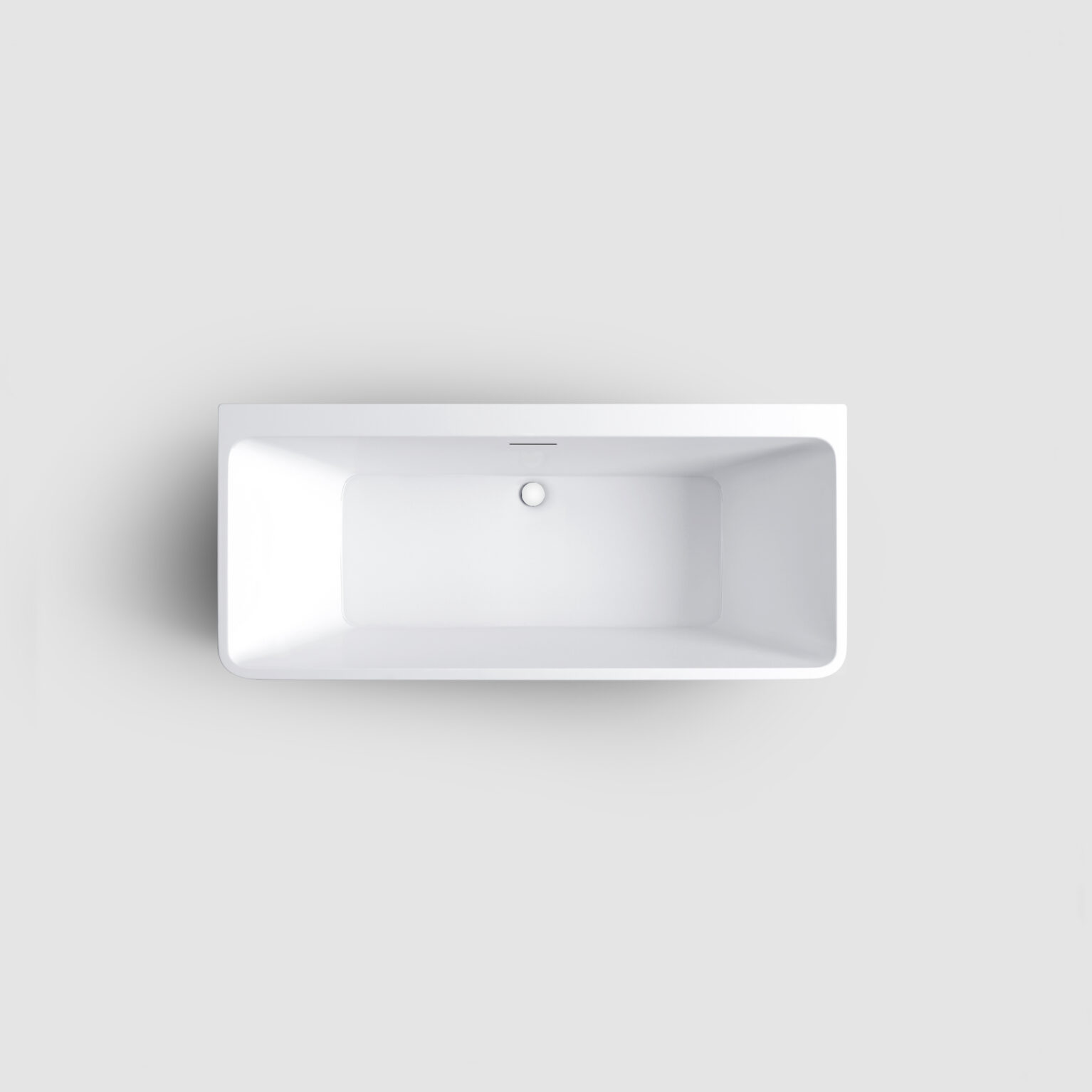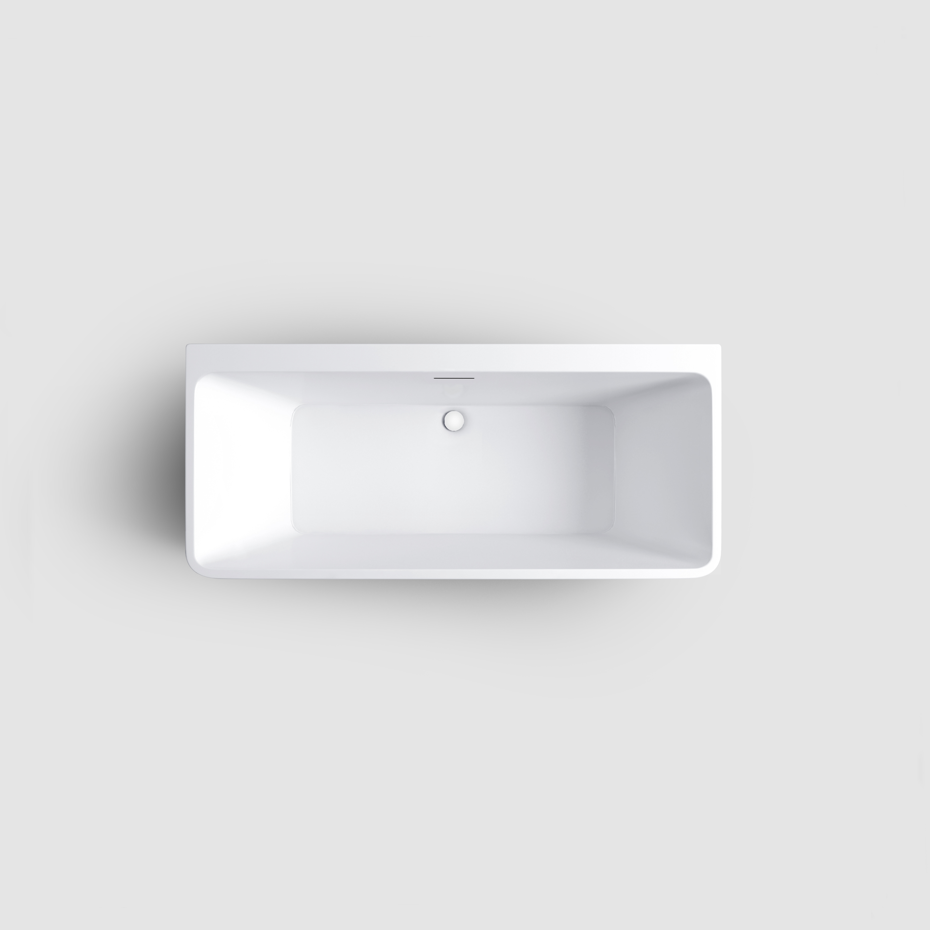 InBe bathtub for placement to the wall, rectangular, white acrylic. White Viega stop/go drain, Viega trap included. Slit overflow. Weight 36kg, volume 270l.