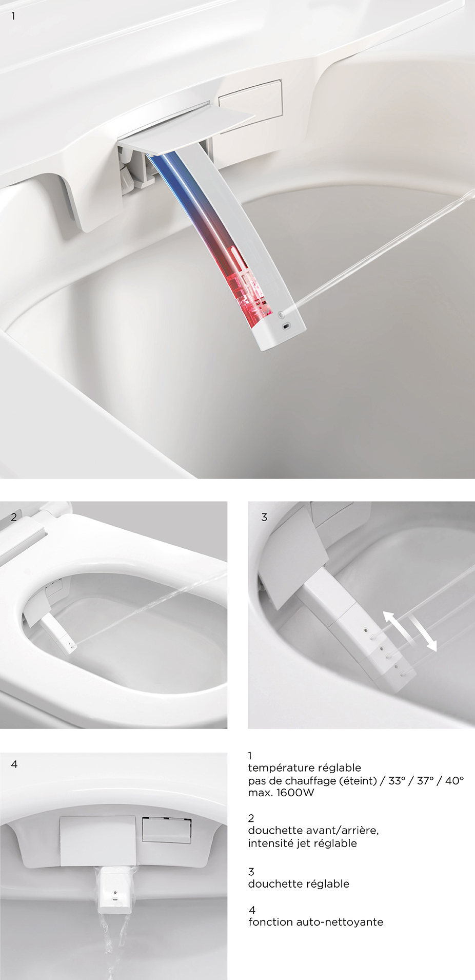 La douchette bidet et la douchette pour dames – avec puissance, température et position réglables – procurent une sensation ultra-confortable et propre.