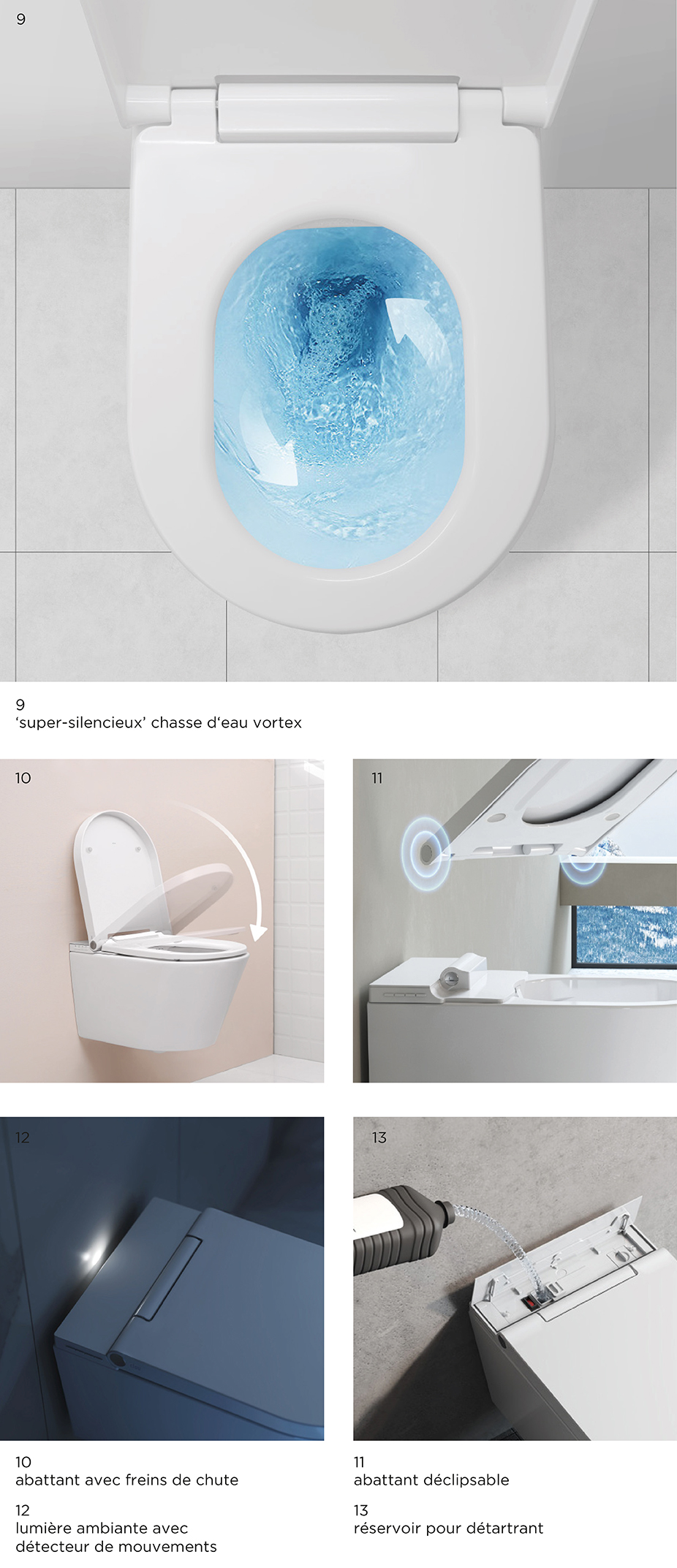 Lorsque vous soulevez le siège, la température souhaitée est toujours atteinte. L'extraction des odeurs démarre automatiquement à l'ouverture du couvercle et s'arrête à sa fermeture.