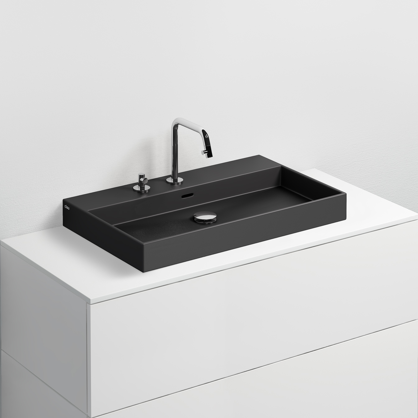 New Wash Me lavabo, avec 3 points d’amorçage, sans bonde, céramique noir mat, épaisseur de parol de 6mm. À suspendre ou à poser.