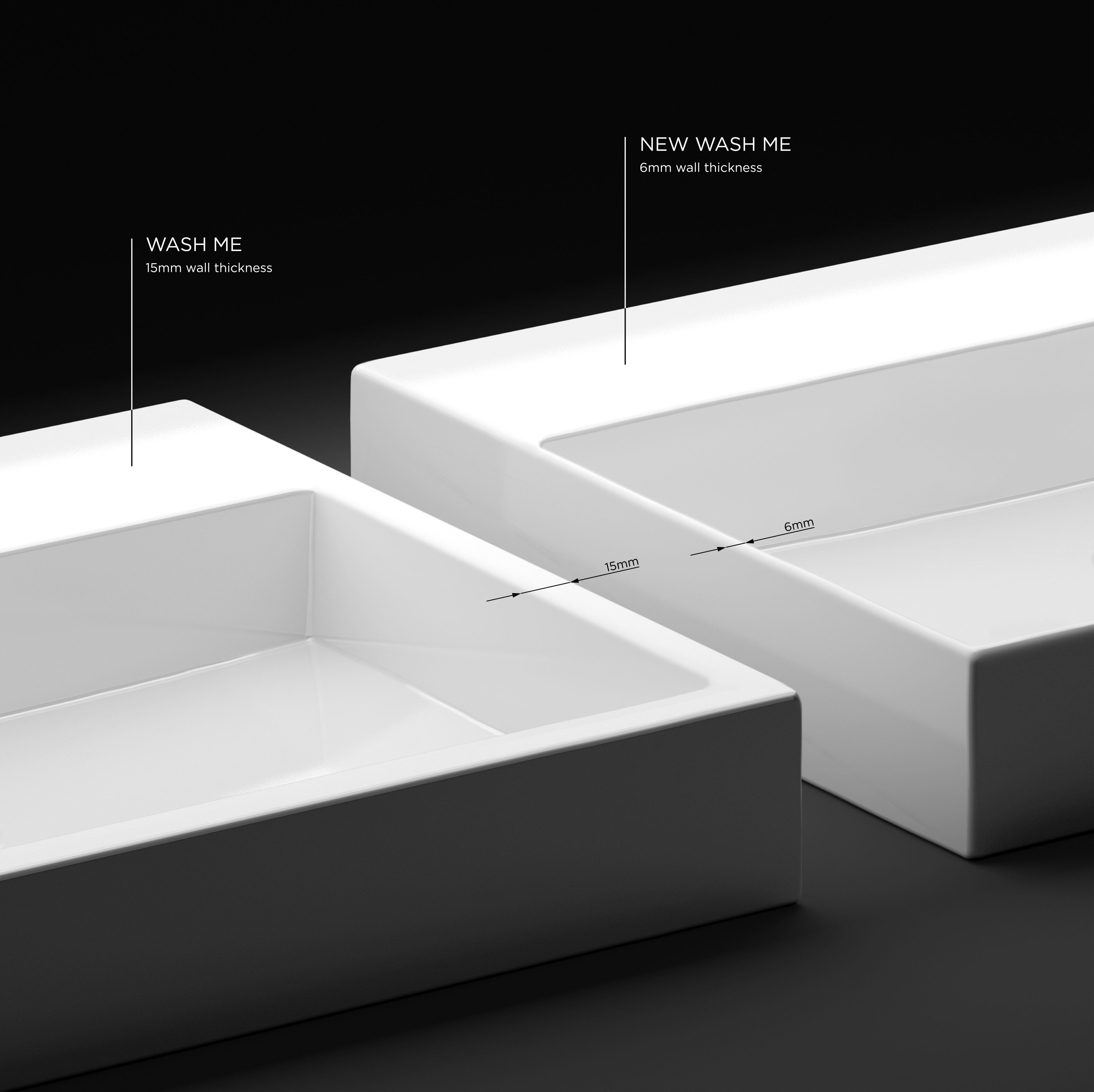 New Wash Me wastafel, met 7 voorbewerkte kraangaten, zonder afvoerplug, 6mm wanddikte, keramiek. Wandhangend en als opzetwastafel te monteren.
