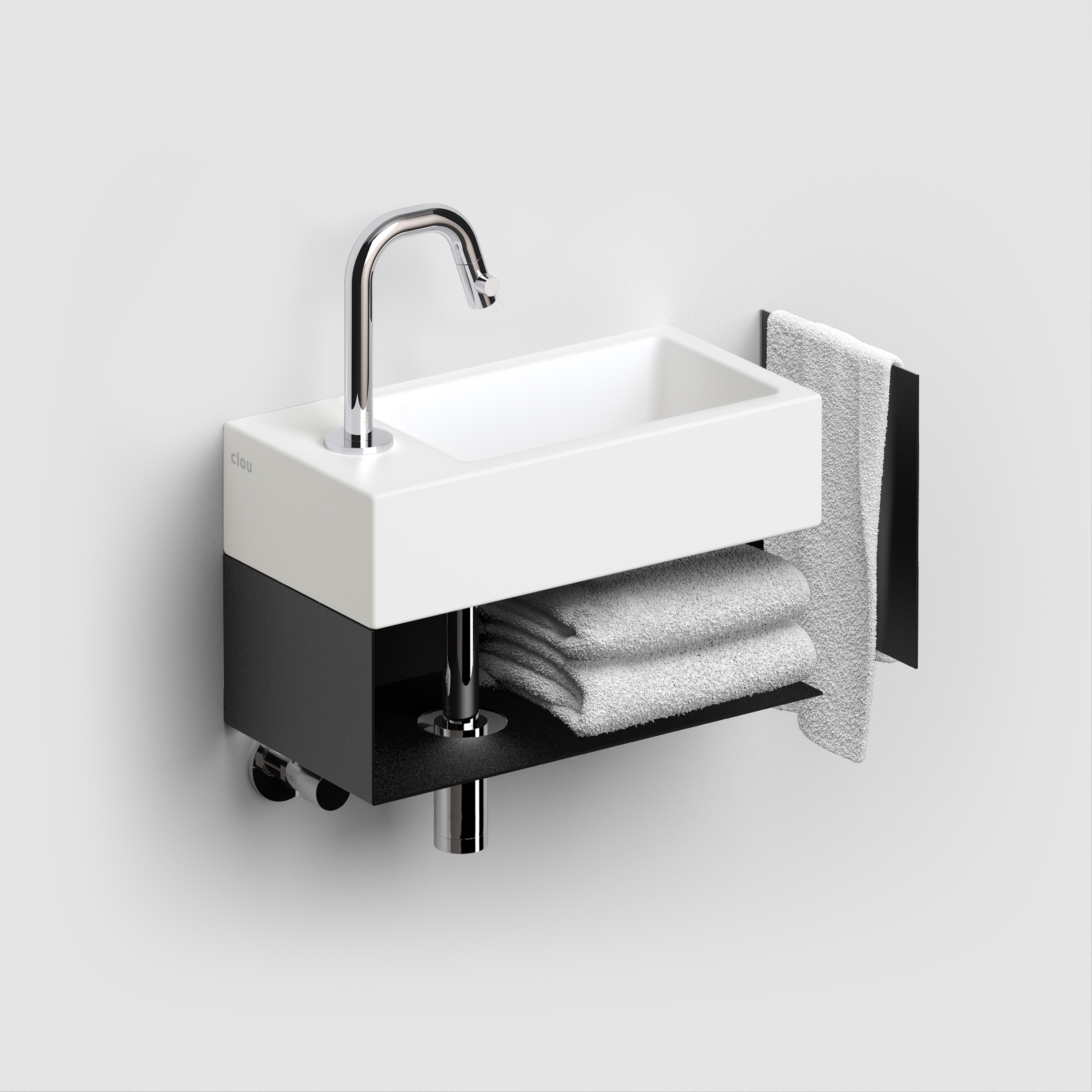 Flush 3 fontein 36cm, met kraangat links, inclusief afvoerplug in chroom, mat wit keramiek. Wandhangend en als opzetwastafel te monteren.