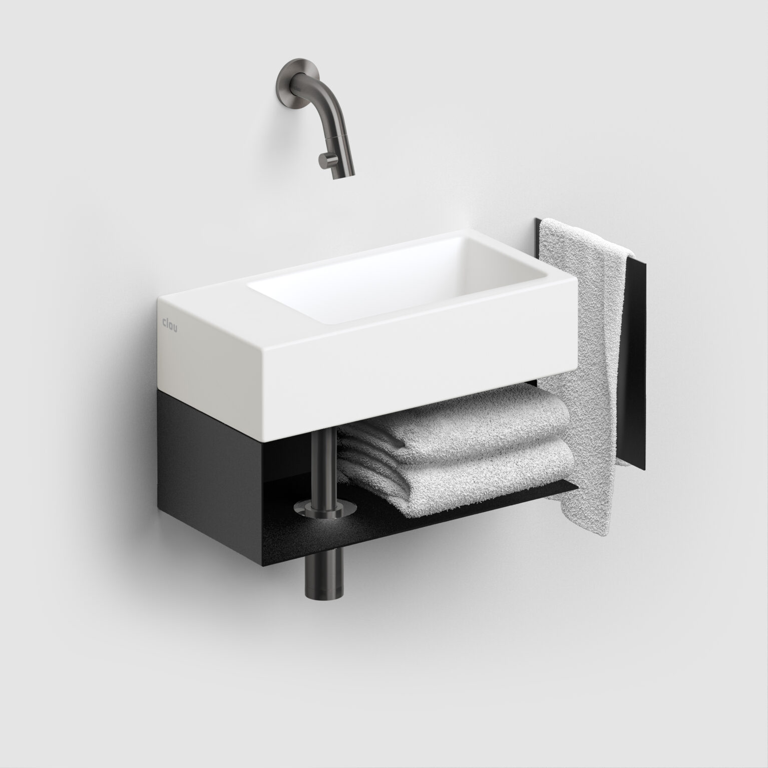 Flush 3 fontein 36cm, zonder kraangat, links, inclusief afvoerplug in chroom, mat wit keramiek. Wandhangend en als opzetwastafel te monteren.