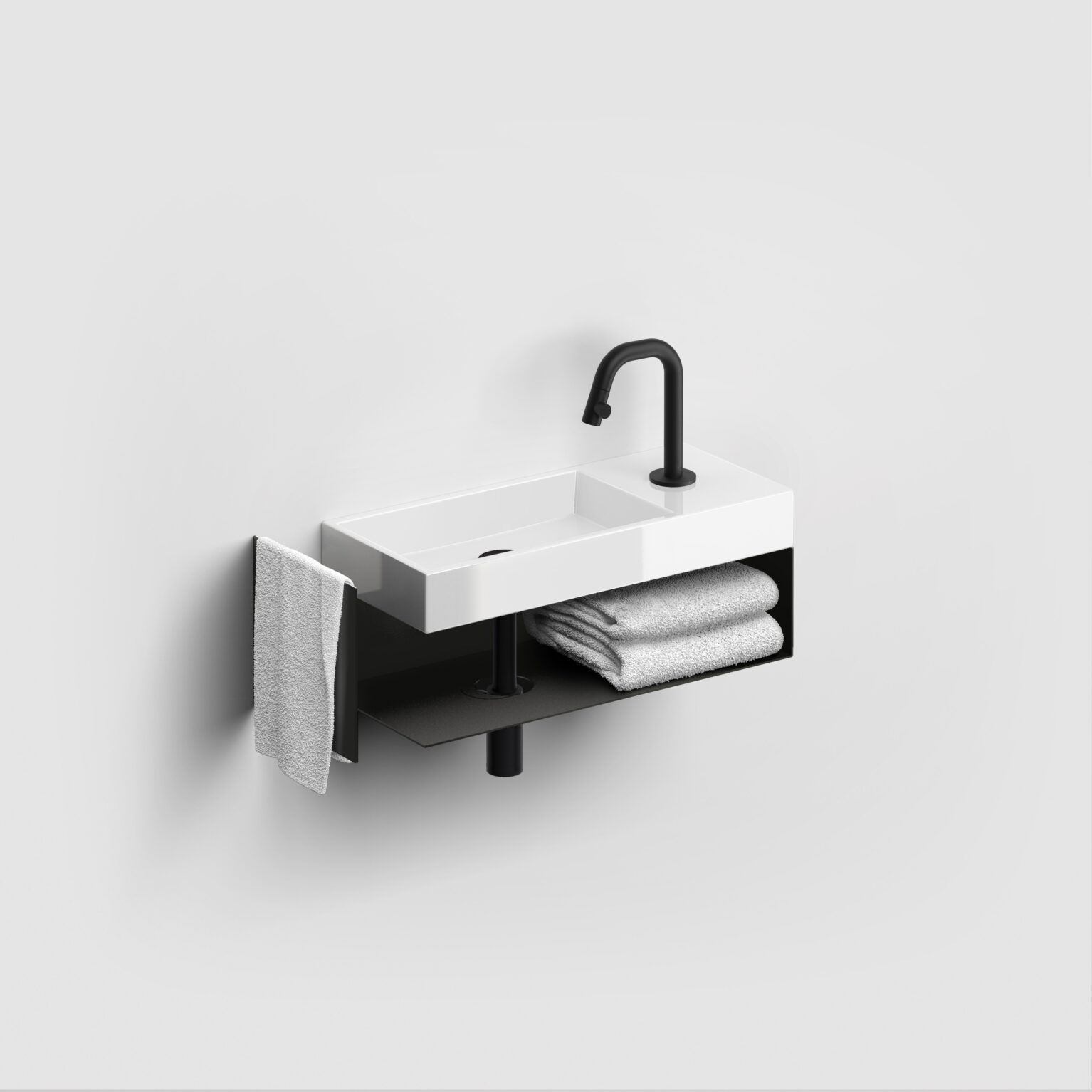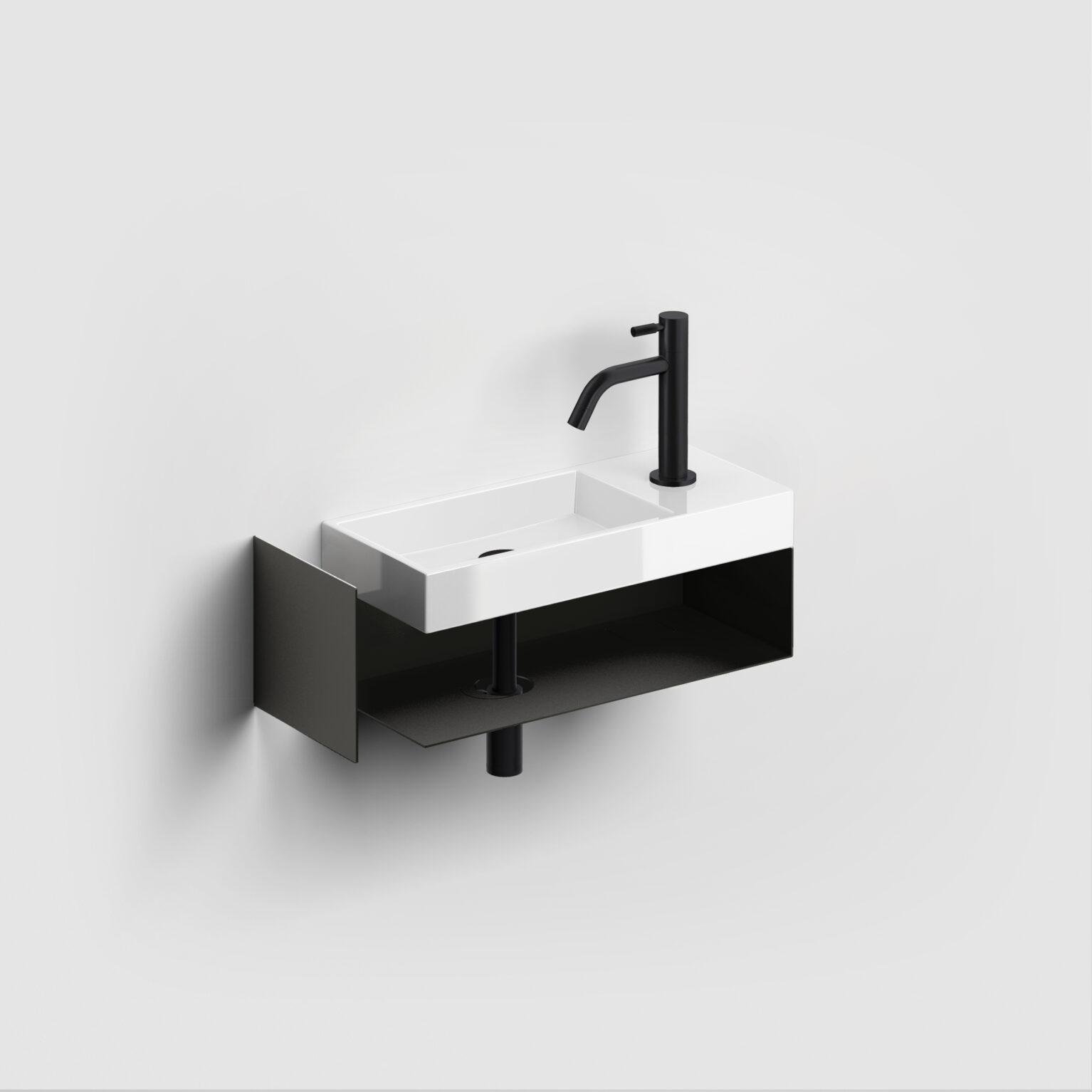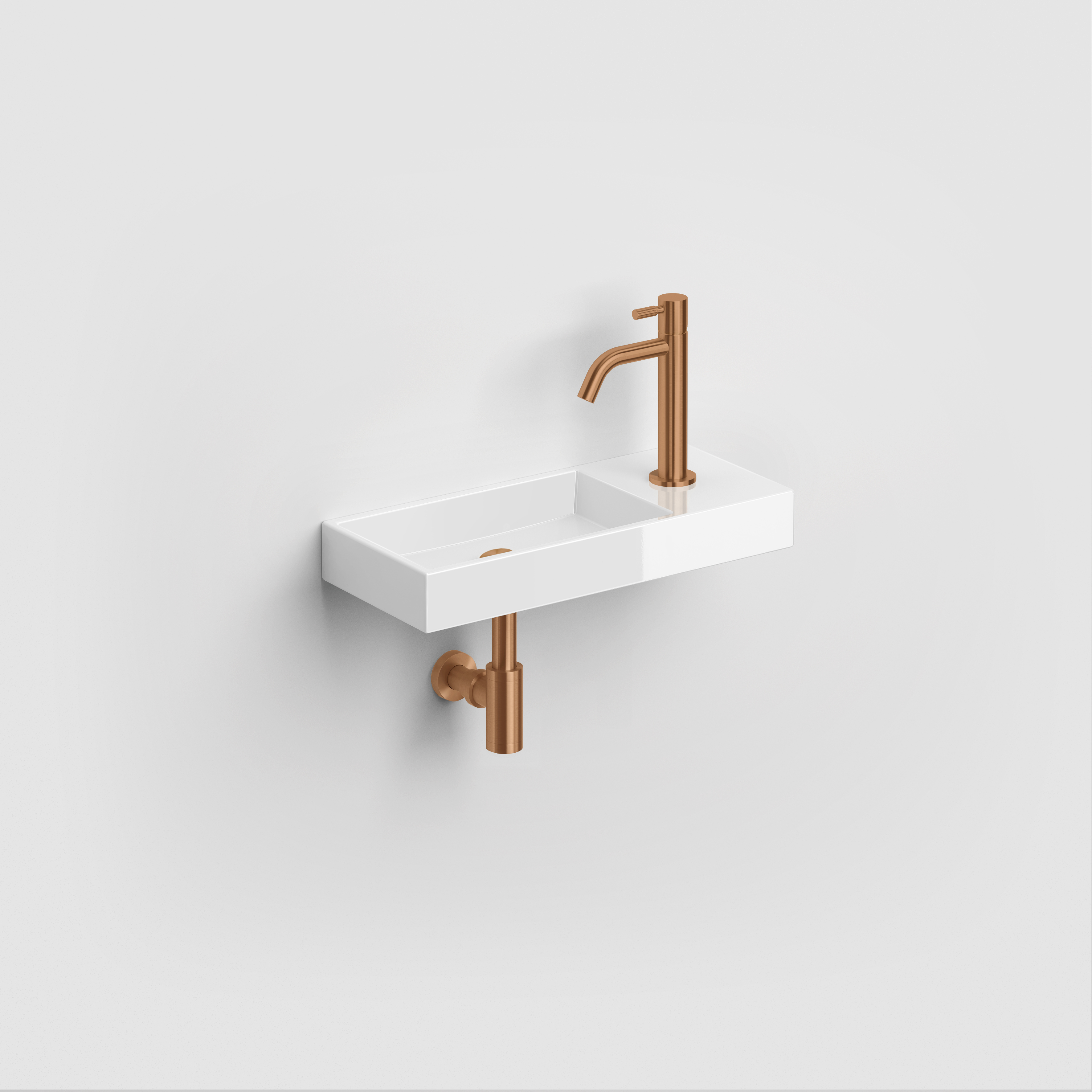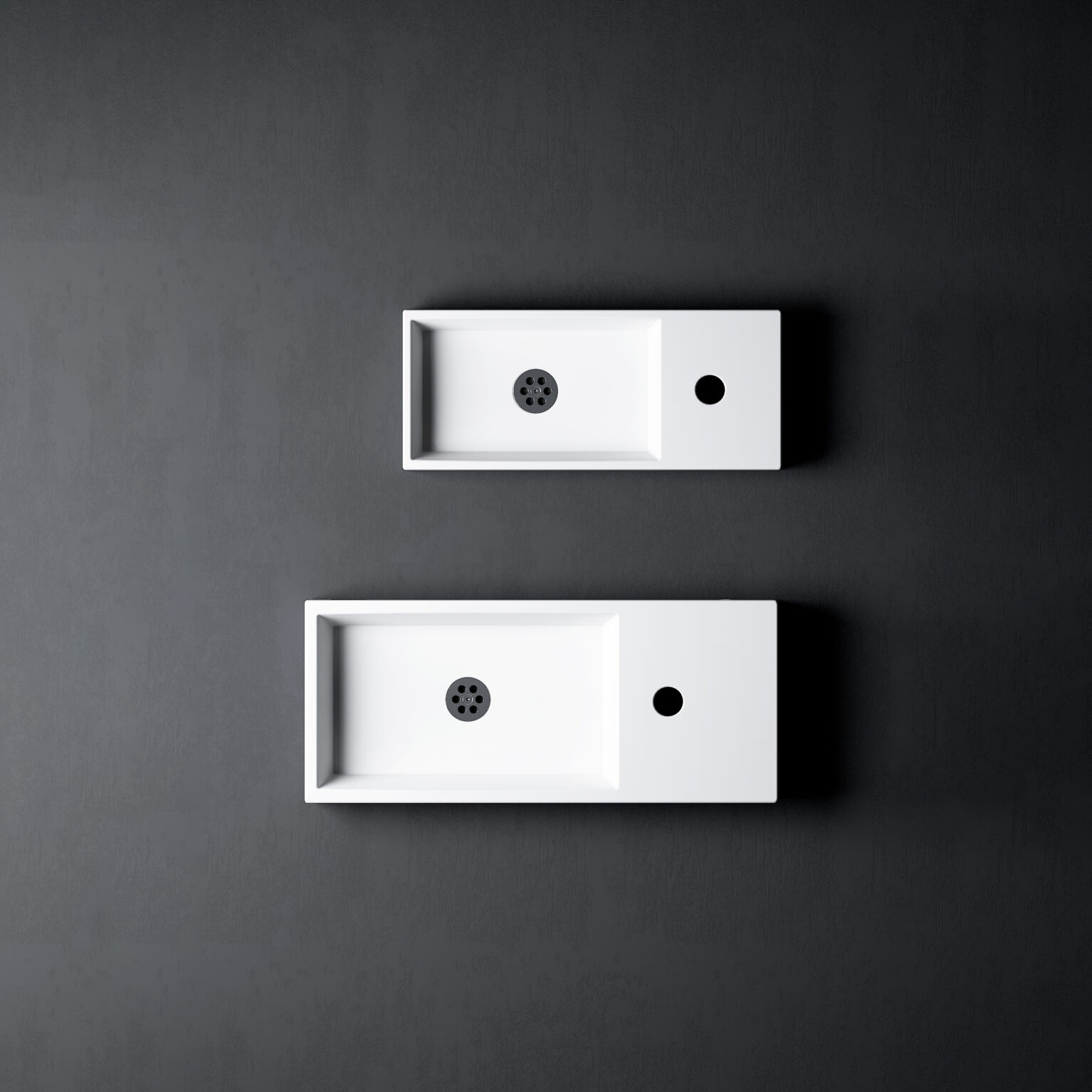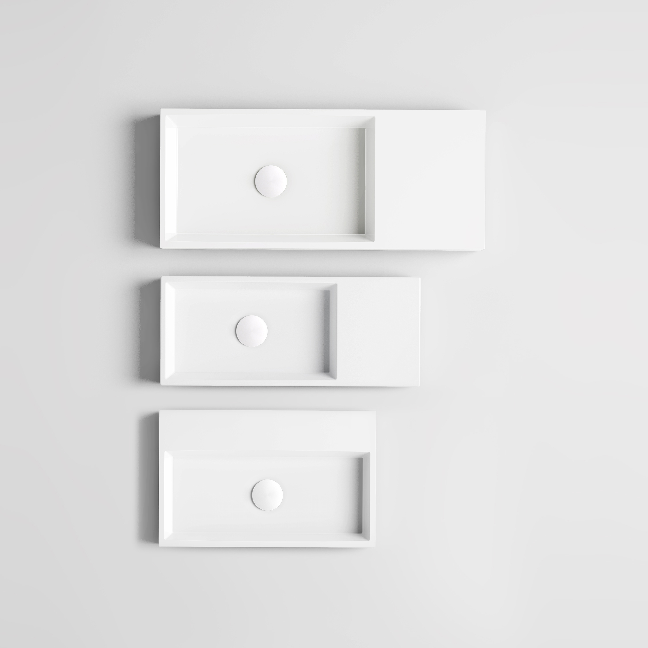 Mini Wash Me fontein 45 cm, met kranenbank rechts met kraangat, wandhangend en als opzetwastafel te monteren. Speciale kleinere afvoerpluggen moeten besteld worden (zie ‘Maak je product compleet’). Een Plus variant is beschikbaar voor de grotere toiletruimtes.