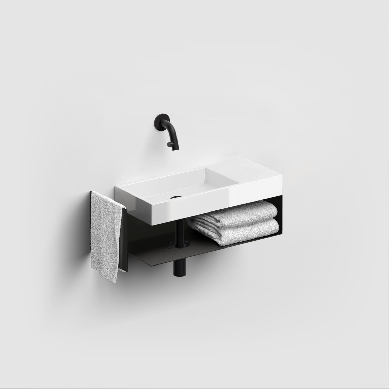 Mini Wash Me fontein 45cm, met kranenbank rechts zonder kraangat, wandhangend en als opzetwastafel te monteren. Speciale kleinere afvoerpluggen moeten besteld worden (zie ‘Maak je product compleet’). Een Plus variant is beschikbaar voor de grotere toiletruimtes.