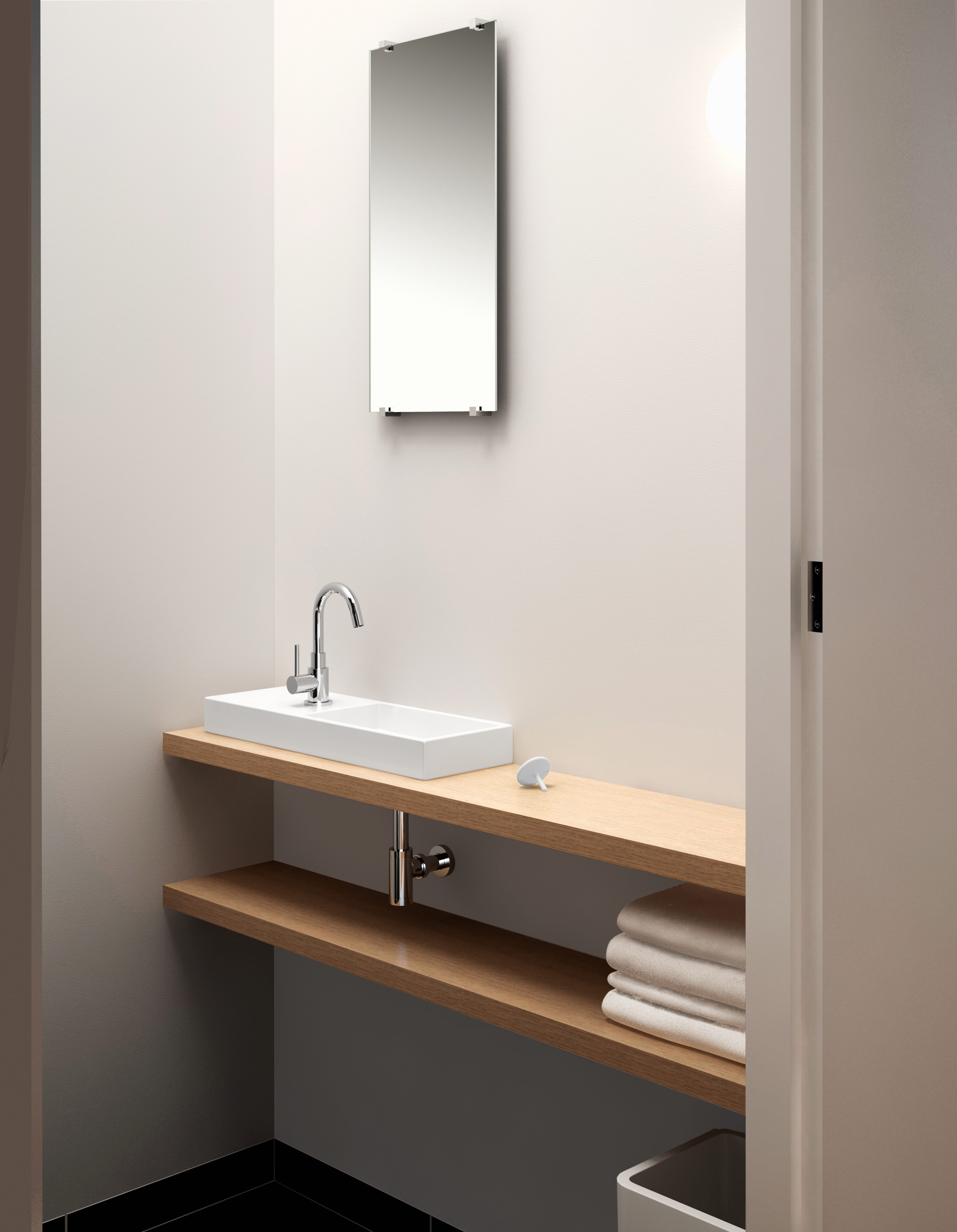 Mini Wash Me fontein 56 cm, kranenbank links, wandhangend en als opzetwastafel te monteren. Zonder plug; speciale kleinere afvoerpluggen moeten besteld worden (zie ‘Maak je product compleet’).