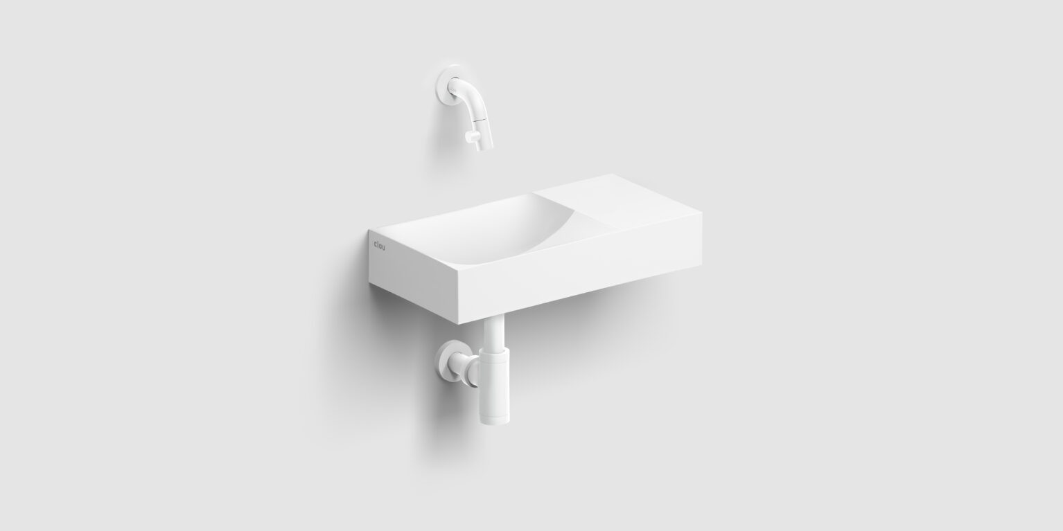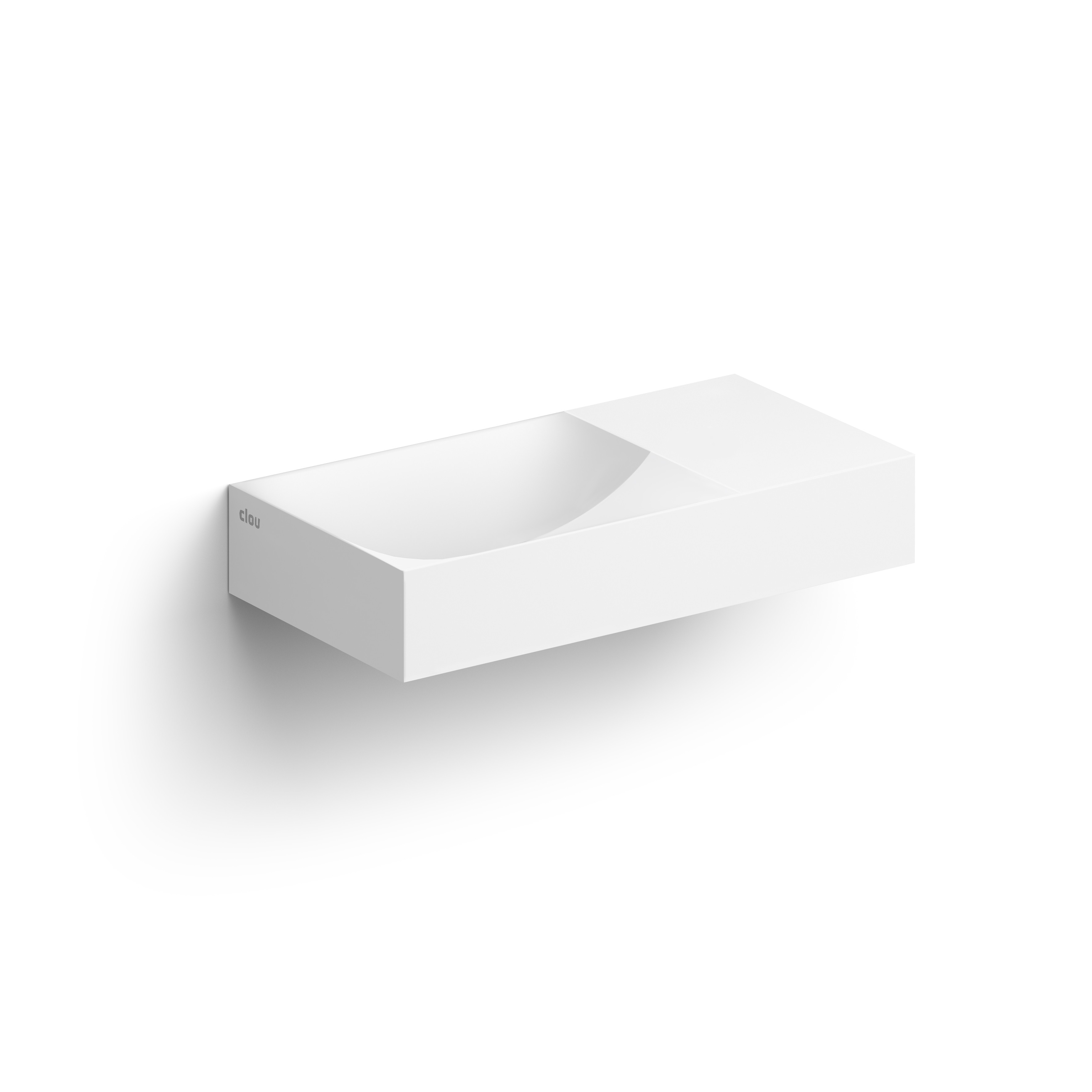 Vale fontein, met voorbewerkt kraangat rechts, met geïntegreerde afvoer, mat wit aluite. Wandhangend en als opzetfontein te monteren. Niet afsluitbaar.