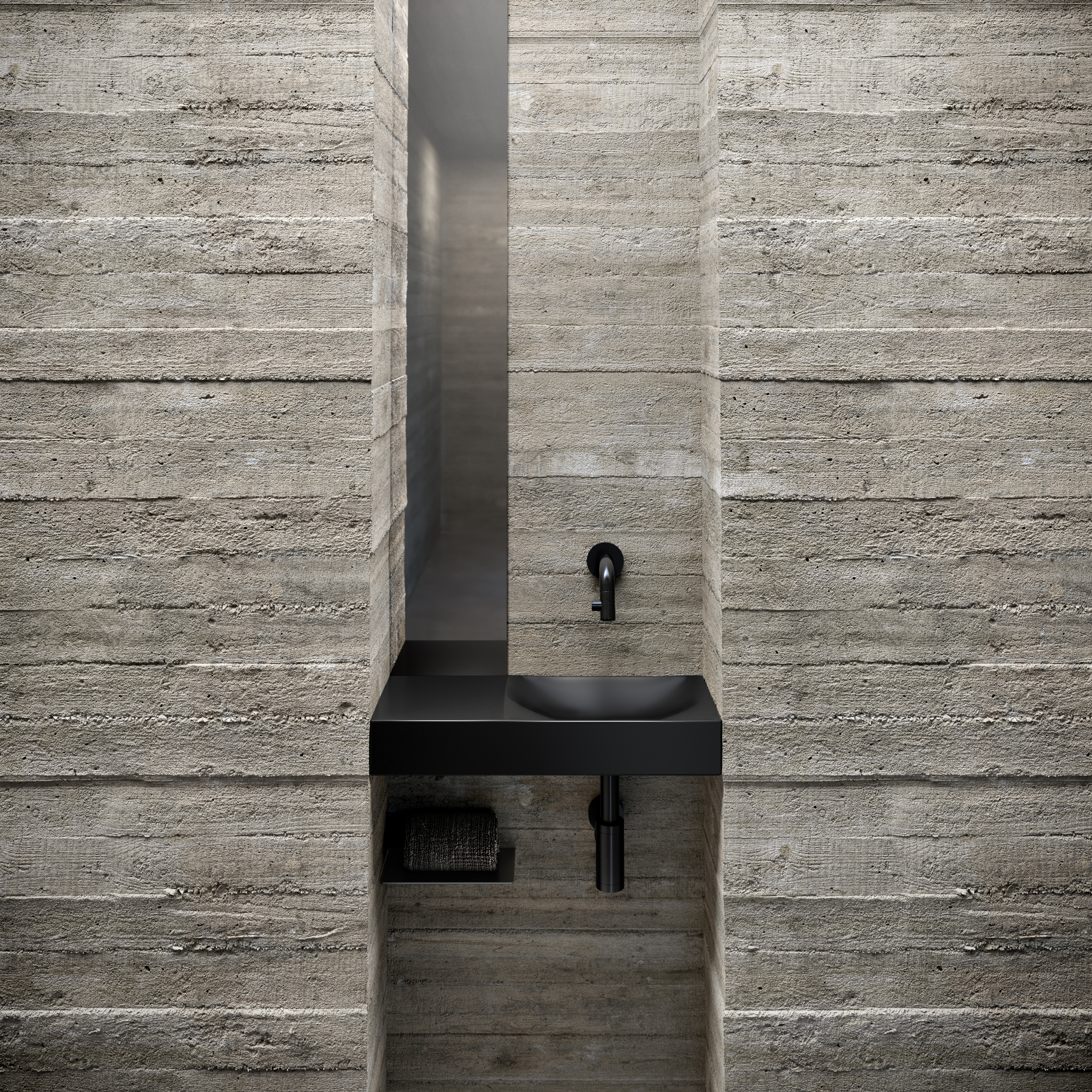 Vale fontein, zonder kraangat links, met geïntegreerde afvoer, mat zwart keramiek. Wandhangend en als opzetfontein te monteren. Niet afsluitbaar.