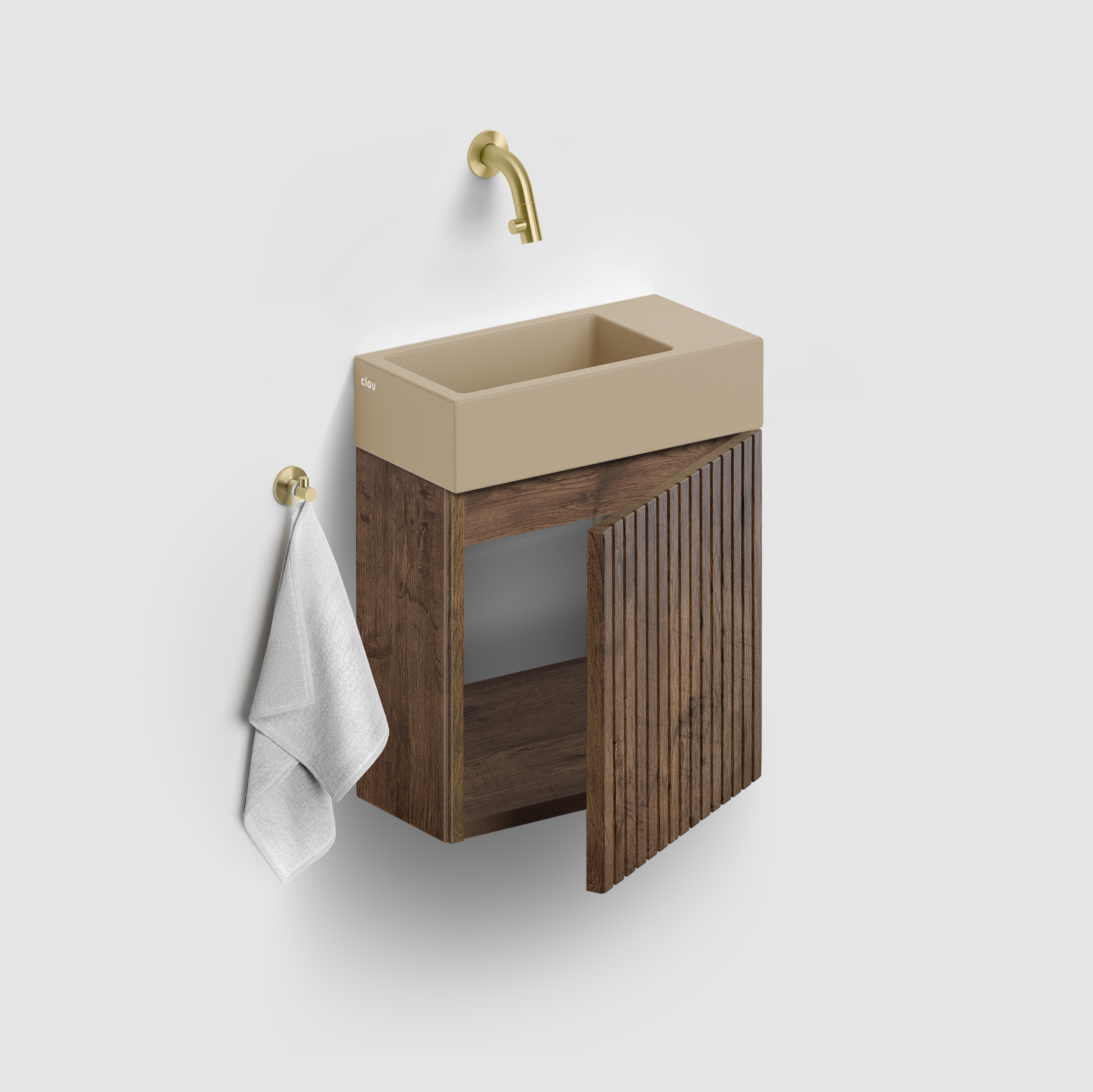 Flush 3 fontein rechts 36cm, zonder kraangat, met afvoerplug, mat mosterd keramiek