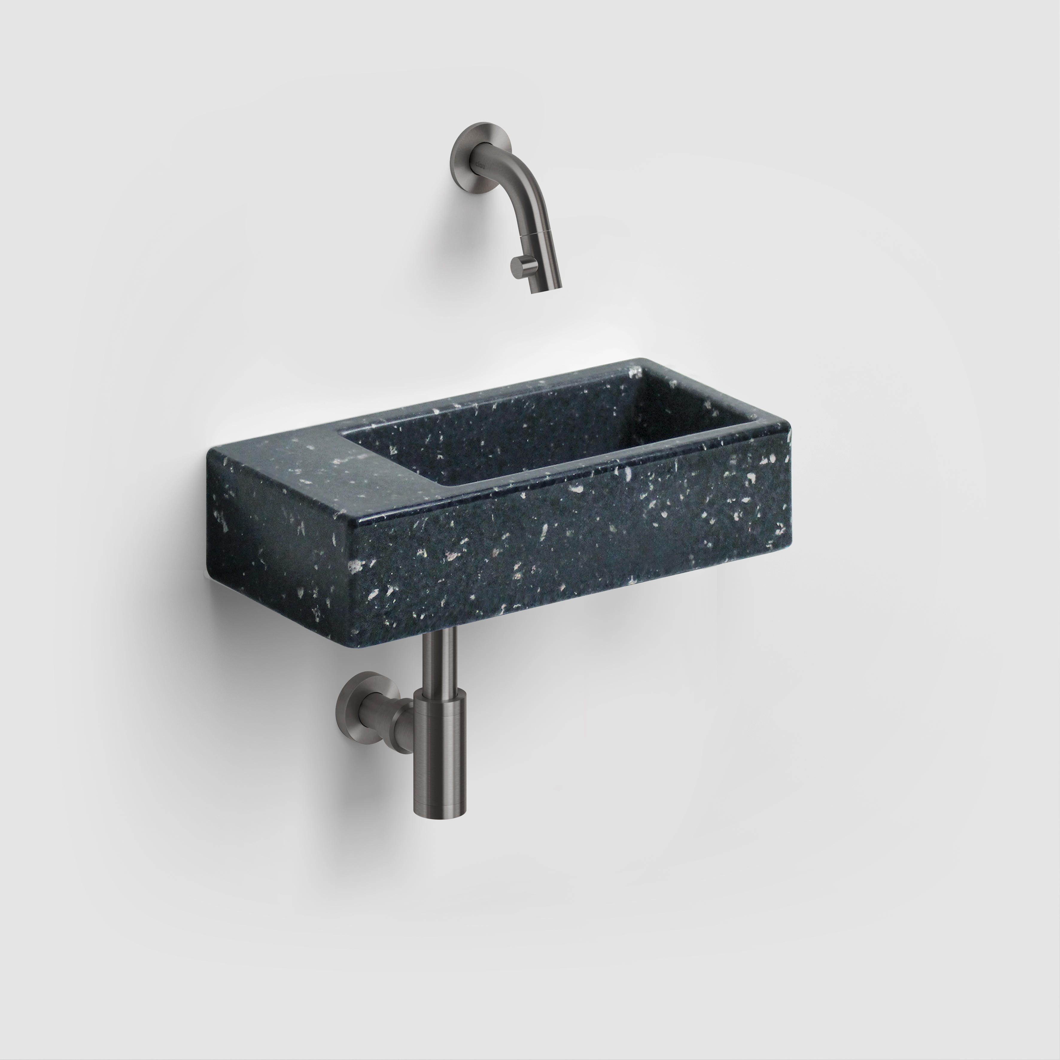 Ecorazzo Flush 3 fontein 36cm, links, zonder kraangat, met afvoerplug, gerecycleerd. Verkrijgbaar in drie PE kleuren: heelal zwart, terra licht en middernacht marine.