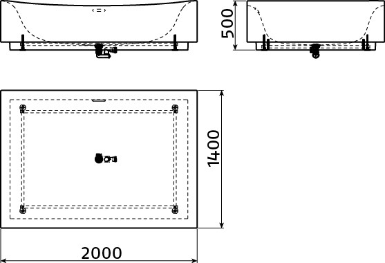 Met Viega stop/go plug, overloop en sifon. Gewicht 160kg, inhoud 465l. Er is een 8cm diepe uitsparing in de vloer vereist.