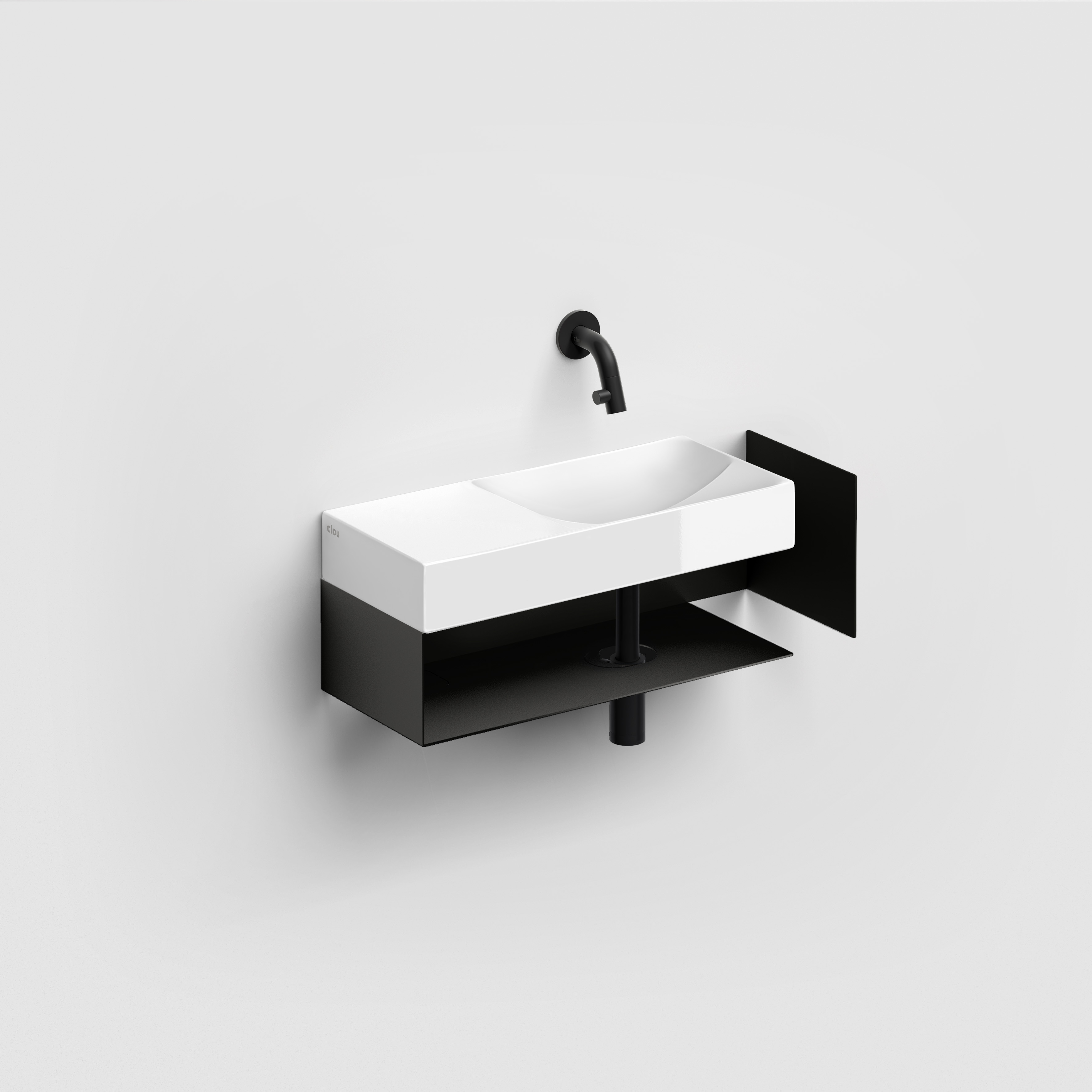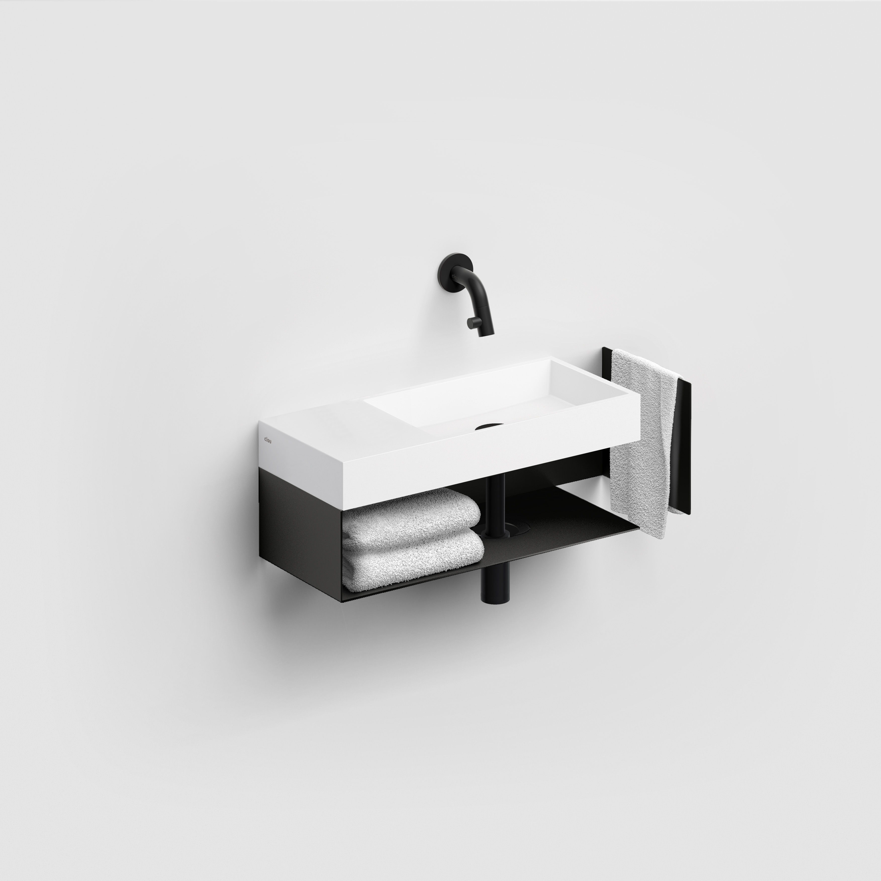 Open kast met handdoekhouder t.b.v. Mini Wash Me 45cm links / Vale 45cm links, zwart gepoedercoat roestvrij staal. Wandhangend. Bevestiging inbegrepen.
