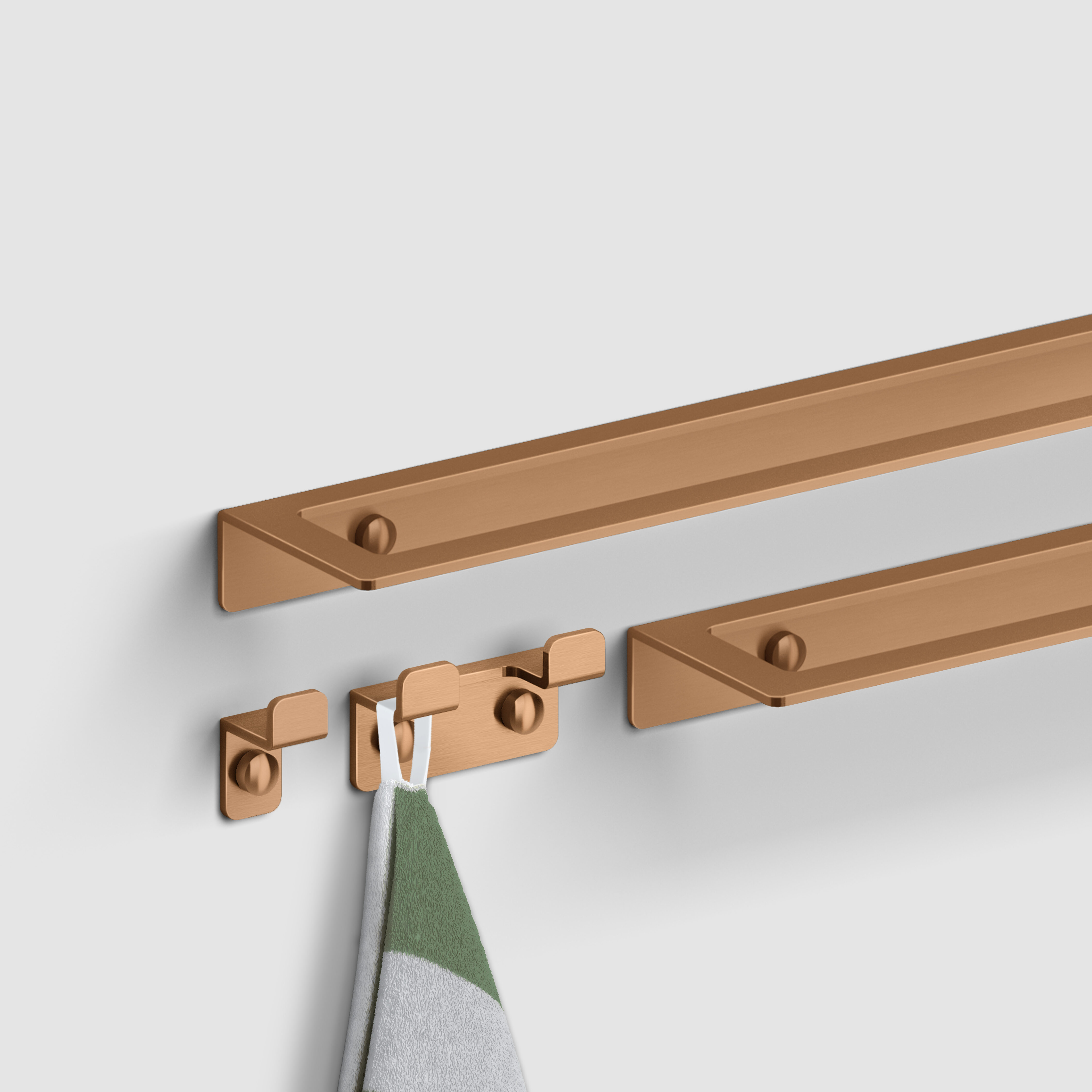 Fold accessoires in chroom, RVS, mat witte of mat zwarte poedercoating, of goud, brons of gunmetal geborsteld PVD.