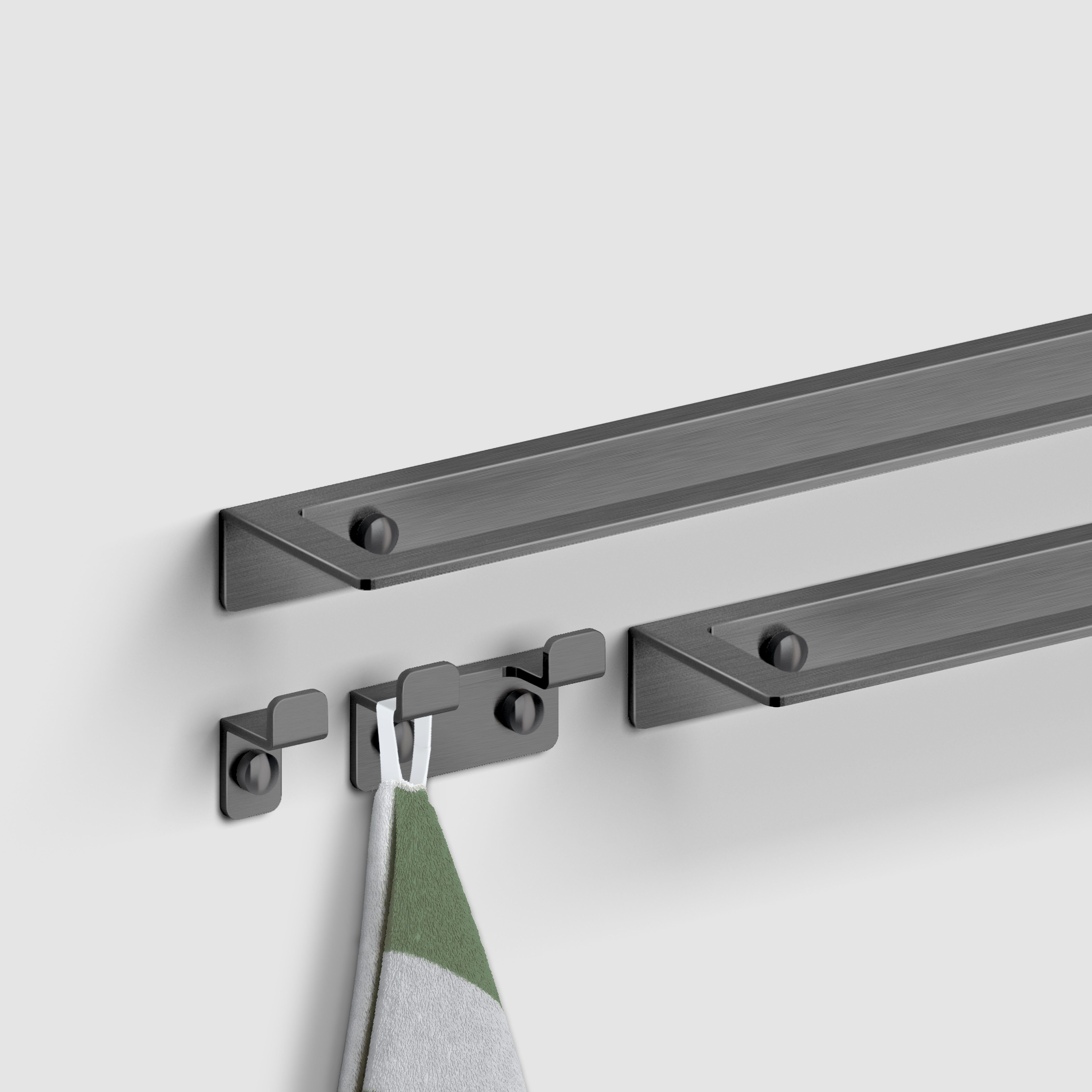 Fold accessoires in chroom, RVS, mat witte of mat zwarte poedercoating, of goud, brons of gunmetal geborsteld PVD.