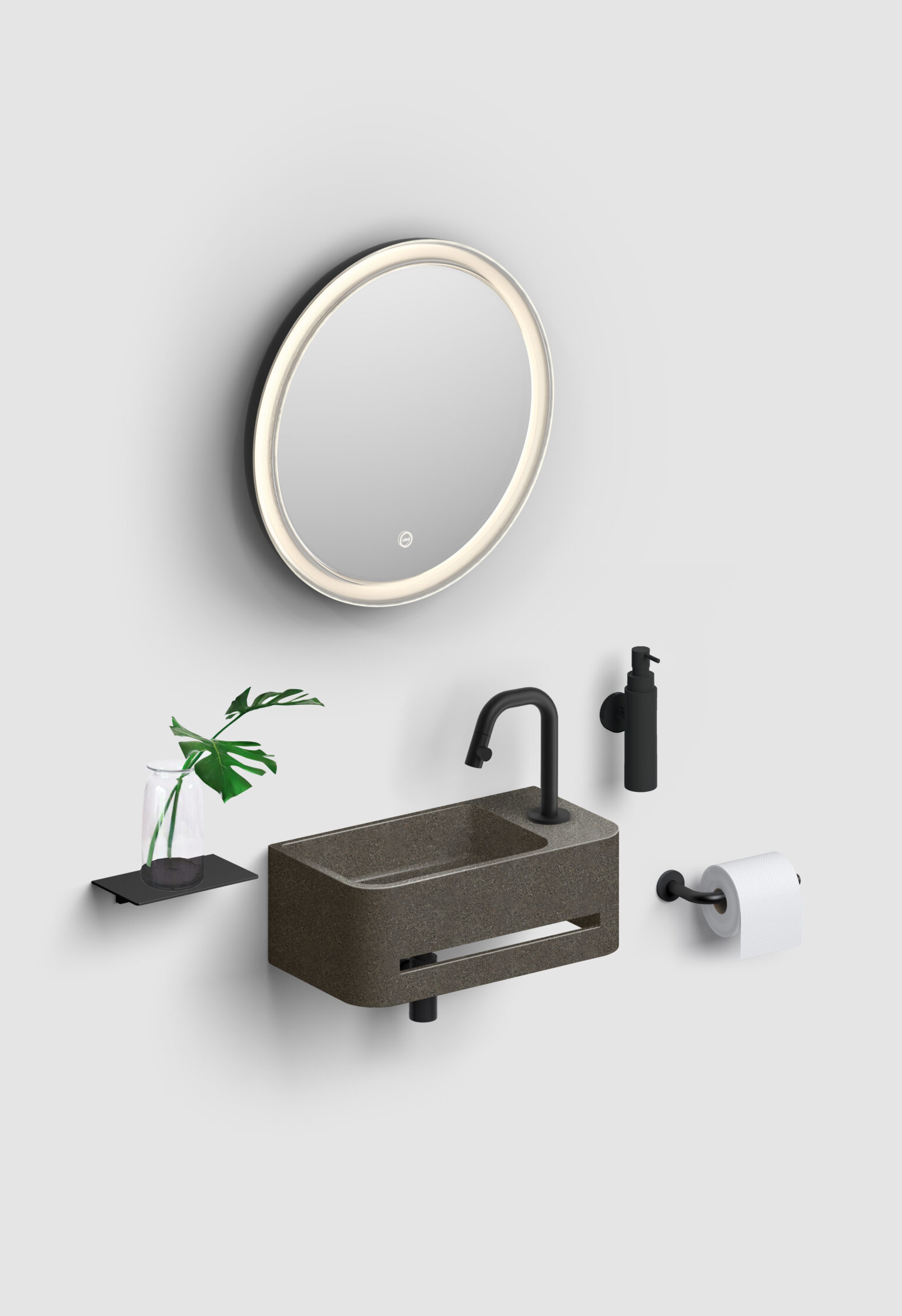 Kaldur accessoires in de kleuren: mat wit, mat zwart, chroom, geborsteld rvs, goud geborsteld PVD, brons geborsteld PVD, gunmetal geborsteld PVD. De serie is perfect te combineren met de Kaldur fontein- en wastafelkranen.