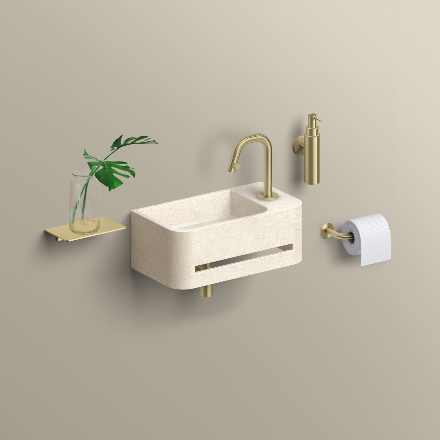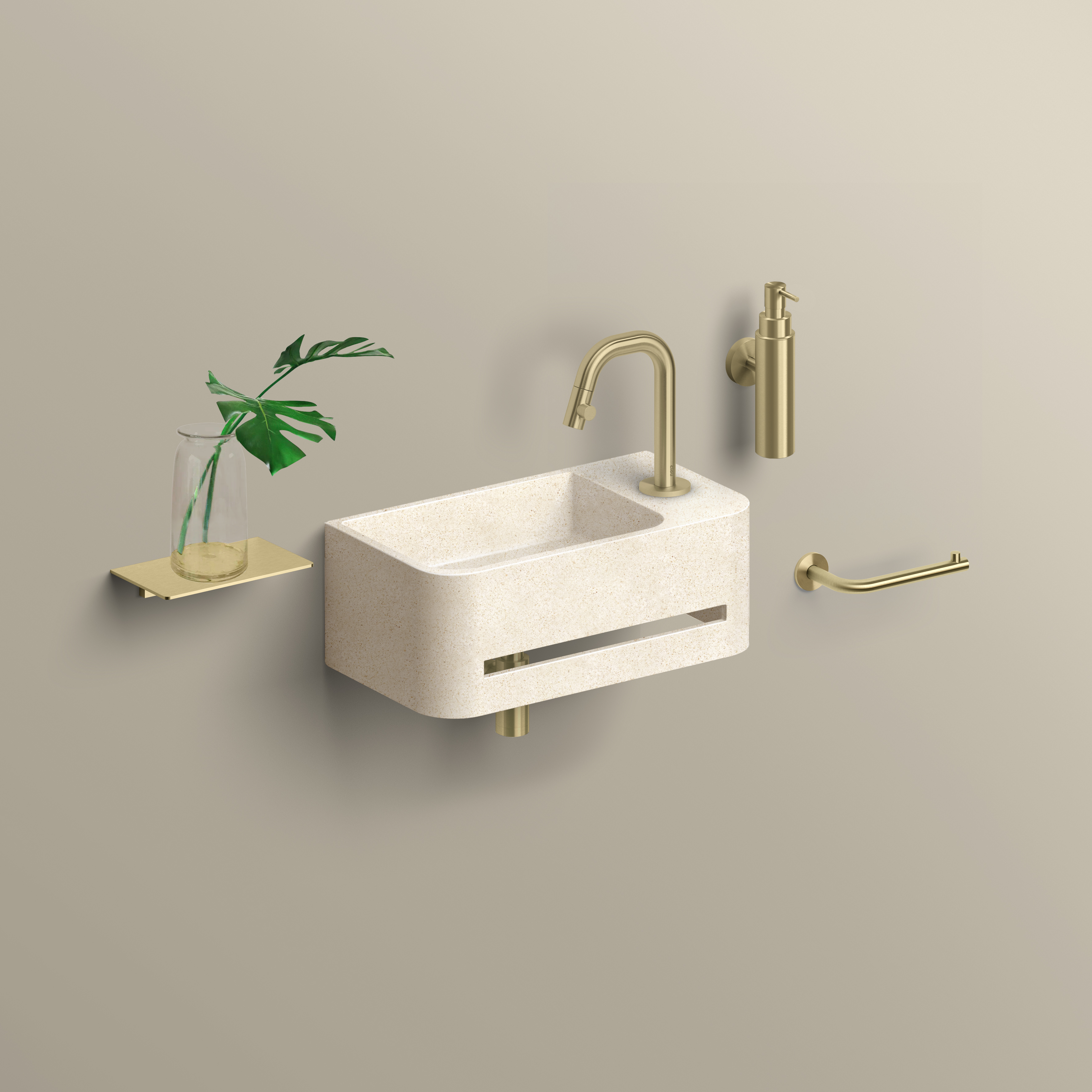 Kaldur accessoires in de kleuren: mat wit, mat zwart, chroom, geborsteld rvs, goud geborsteld PVD, brons geborsteld PVD, gunmetal geborsteld PVD. De serie is perfect te combineren met de Kaldur fontein- en wastafelkranen.