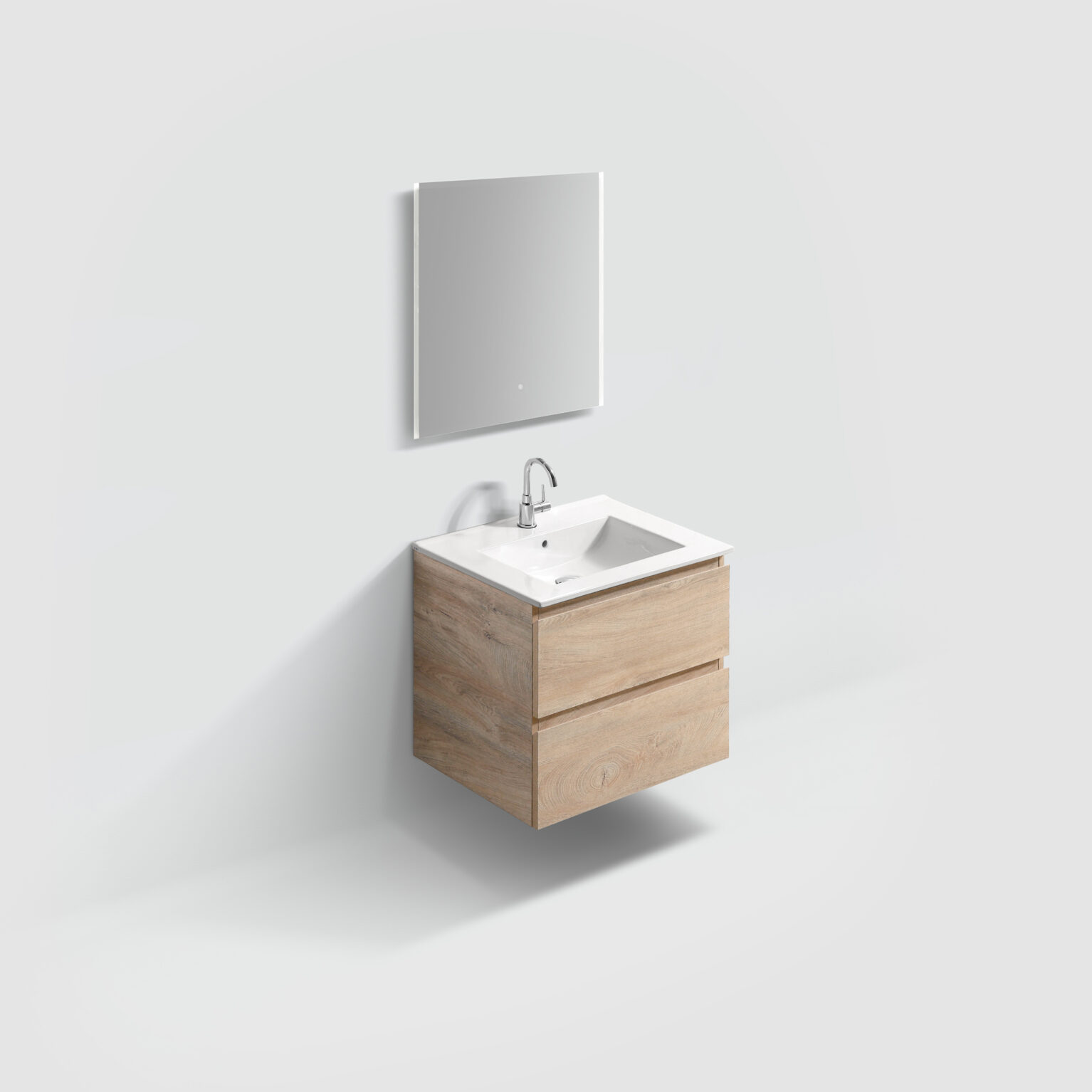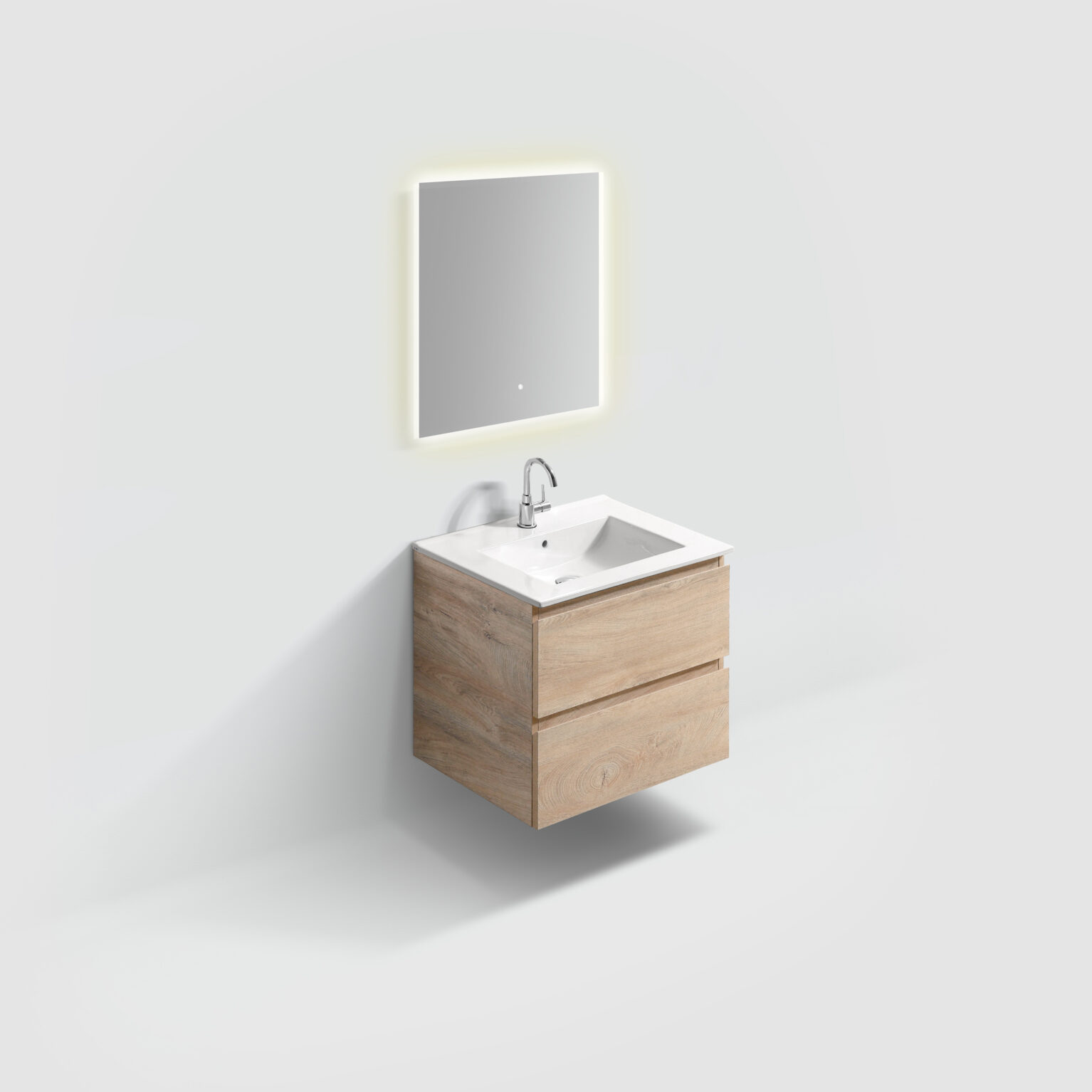 Badkamermeubel met 2 lades 60cm, wastafel wit keramiek met kraangat, LED spiegel 2700K. Grieks eiken.