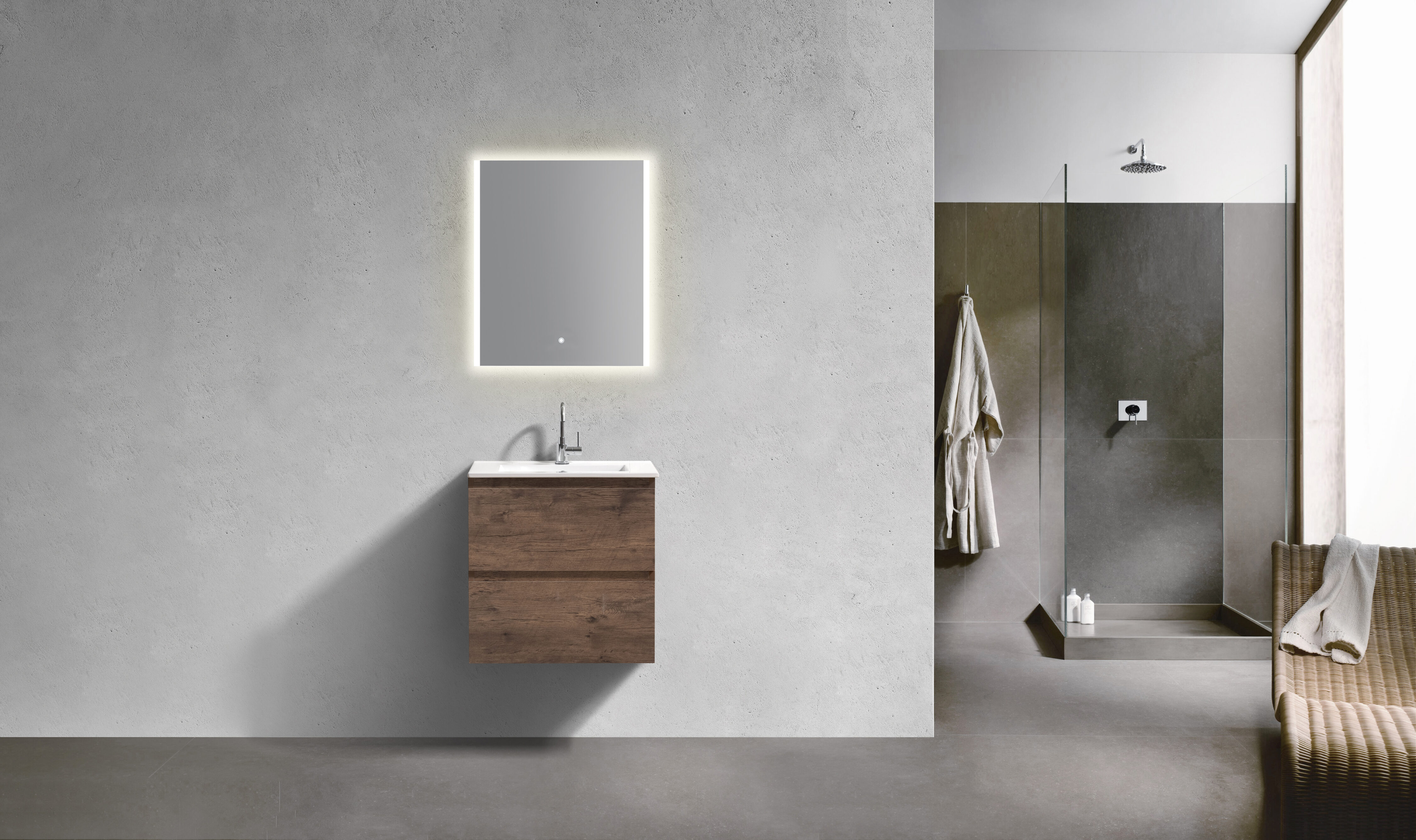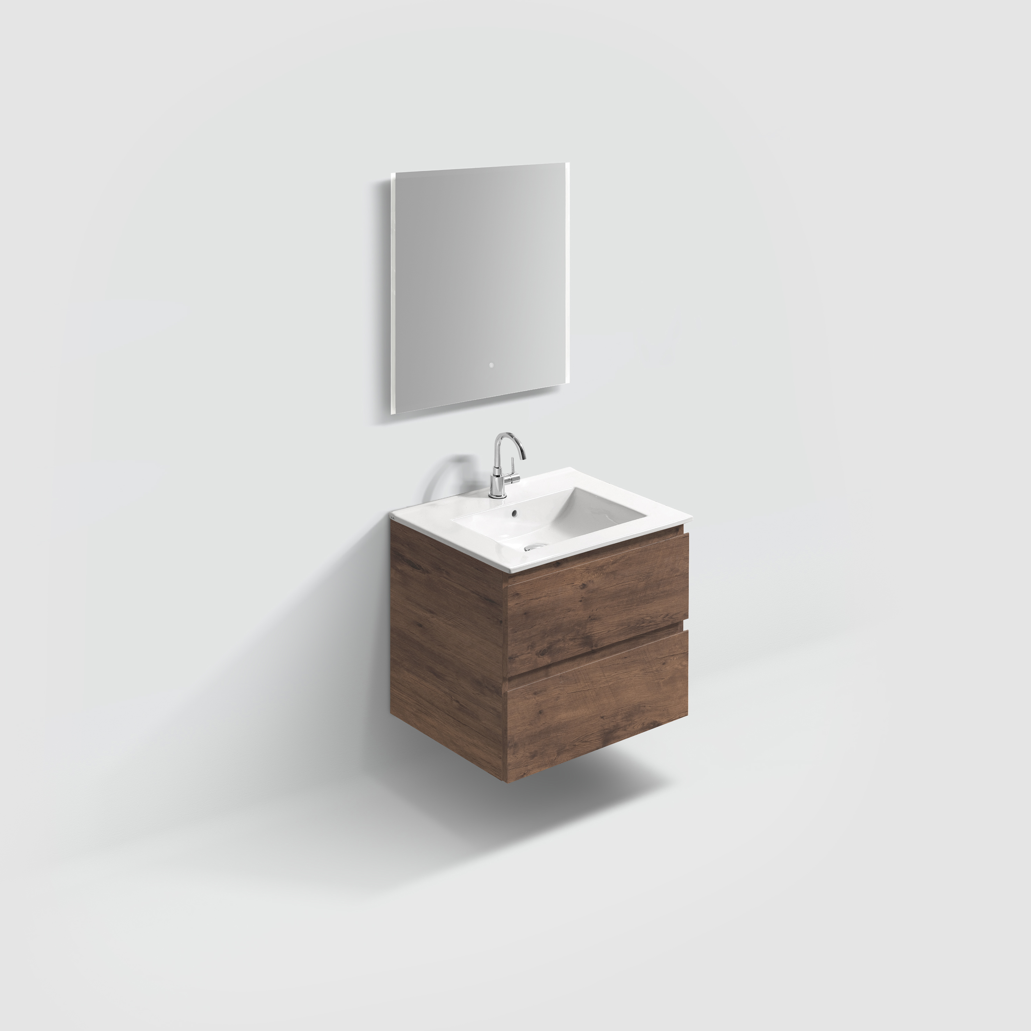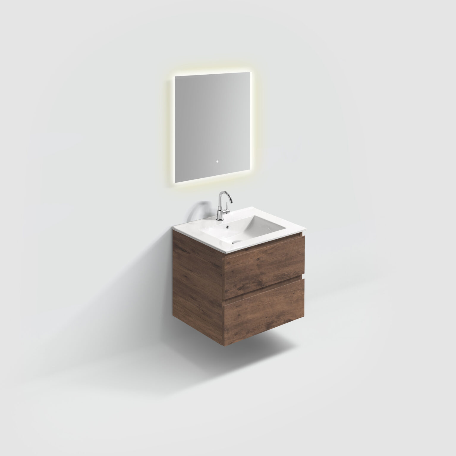 Badkamermeubel met 2 lades 60cm, wastafel wit keramiek met kraangat, LED spiegel 2700K. Donker eiken.