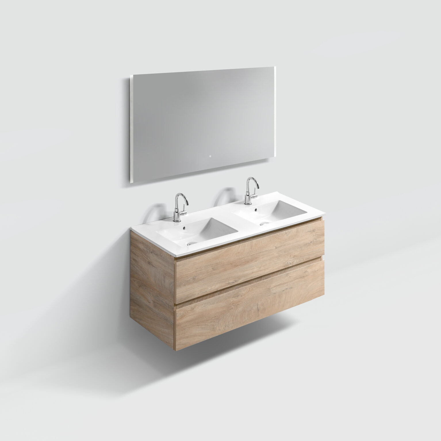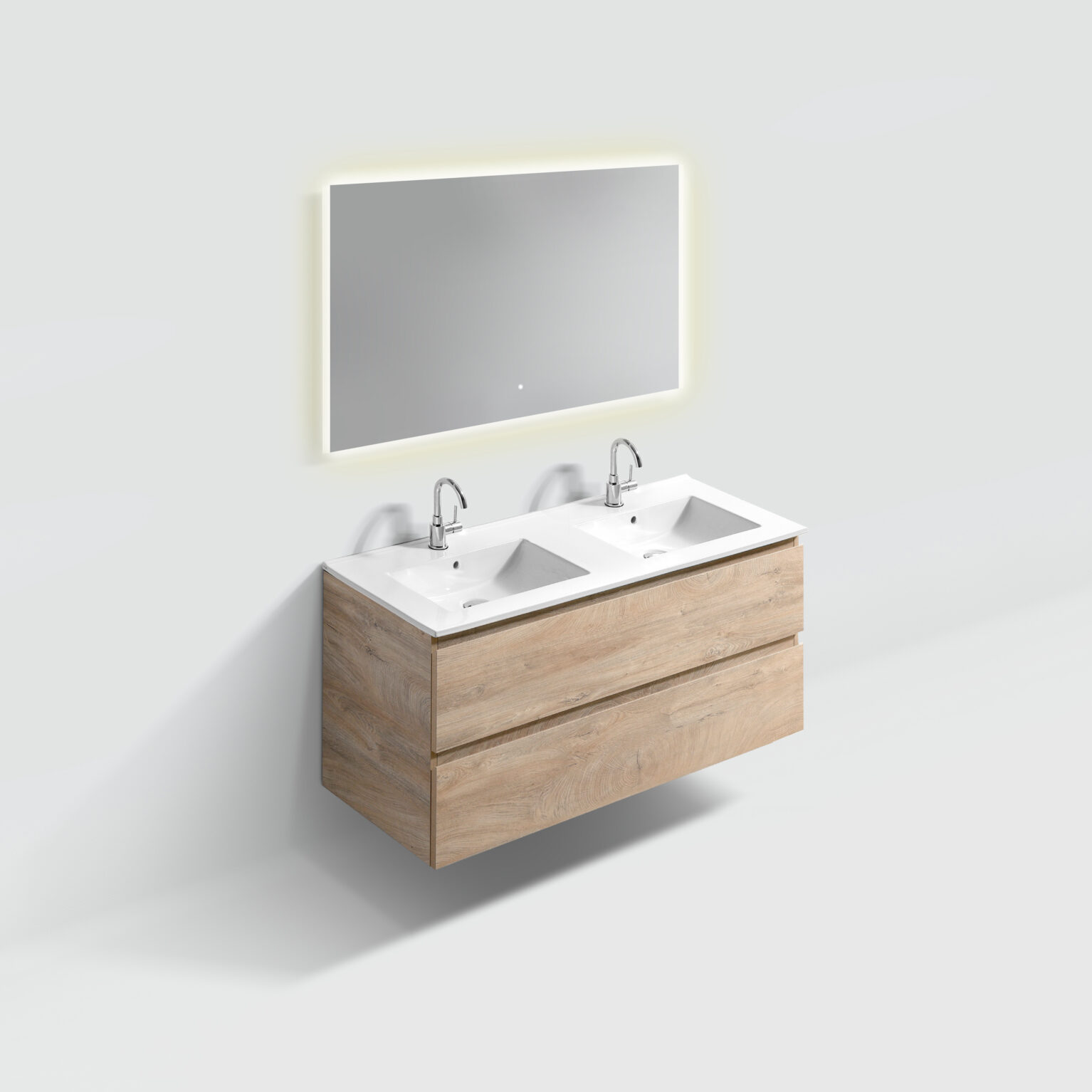Badkamermeubel met 2 lades 120cm, dubbele wastafel wit keramiek met kraangat, LED spiegel 2700K. Grieks eiken.